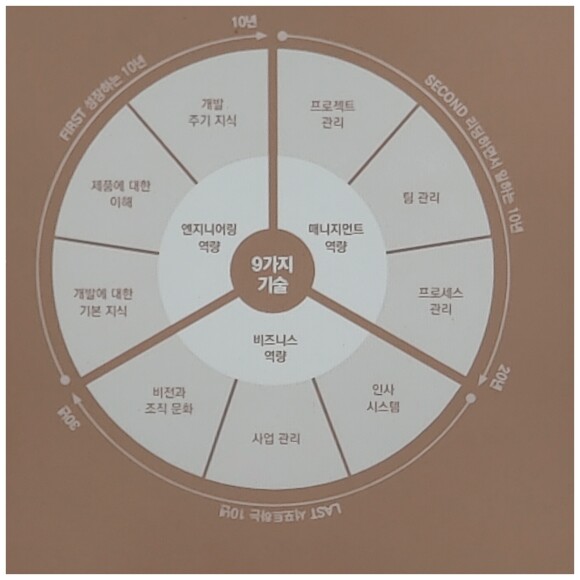1장에서는 개발자로 성장하기 위한 엔지니어링 역량, 2장에서는 팀을 리드할 수 있는 매니지먼트 역량, 3장에서는 조직을 서포트할 수 있는 비즈니스 역량을 소개합니다. 각 장에서는 필요한 기술 3가지를 설명하며, 총 9가지 기술(개발에 필요한 기술, 프로젝트 관리, 사업 관리 등)을 이 책을 통해 습득할 수 있습니다.