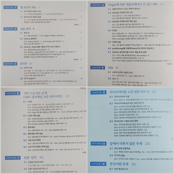 다만 백엔드 보안에 관련해서는 다루지 않으므로 이 책을 추천하기 힘들며, 암호 기술과 네트워크·통신과 같은 어렵지만 보안에서 중요한 부분도 이 책에서 다루지 않습니다. 책에서는 해당 주제에 대한 설명을 생략하는 대신에 『브라우저 해킹 vs 보안』(아쉽게도 절판...)을 추천하니 참고하시길 바랍니다.