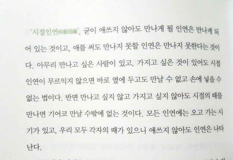 마지막 챕터에서는 밀레니얼 세대의 관계에 대한 이야기를 다루고 있는데, 애쓰지 않아도 만나게 될 인연은 만나게 되고, 애를 써도 만나지 못할 인연은 만나지 못한다는 '시절인연'의 마음가짐으로 인간관계를 유지한다면, 어떠한 집착이나 바람 내지는 욕심으로부터 자유로워질 수 있을 것 같다는 생각이 들었다.