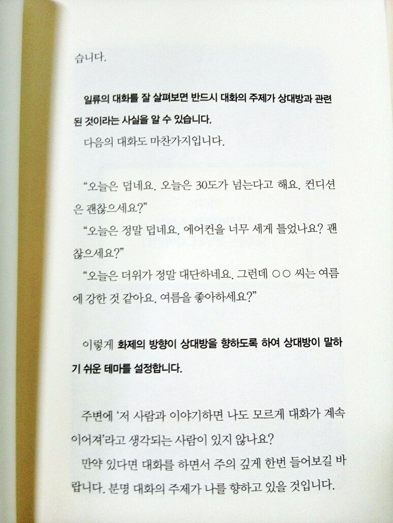 대화를 하려고 한마디를 꺼냈는데, 침묵으로 끝나는 이런 상황. 누구나 한 번쯤 겪어봤을 것이다. 이렇게 극단적으로 대화 종결 상황을 맞닥뜨리지 않으려면 어떻게 해야 할까? 이 책에선 '화제의 방향이 상대방을 향하도록 하여 이야기의 실마리를 제시'하는 것이 일류의 대화법이라고 말한다. 예를 들면 "오늘은 덥네요. 컨디션은 괜찮으세요?"라는 식으로 포석을 깔라는 것! 가장 기본적이면서 중요한 대화법이란 생각이 들었다.