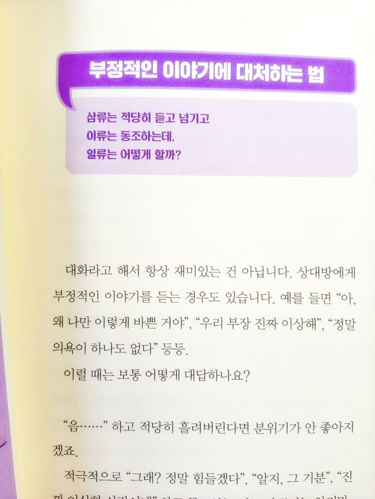 대화를 하다 보면 부정적인 내용의 대화를 듣는 경우도 있는데, 이럴 때는 이야기를 듣고 나서 마지막에 상대방을 인정하고 칭찬하고 격려하면 된다고 한다. 예를 들면 "요즘 너무 바빠서 힘드네요"라는 말을 상대에게 들었다면, "그렇게 바쁜 와중에도 초인적인 힘을 발휘하시네요. 정말 대단하신 것 같아요."라고 상대방을 인정해 상대방의 기분을 플러스로 만들면 대화 분위기가 밝아질 수 있을 것이다.