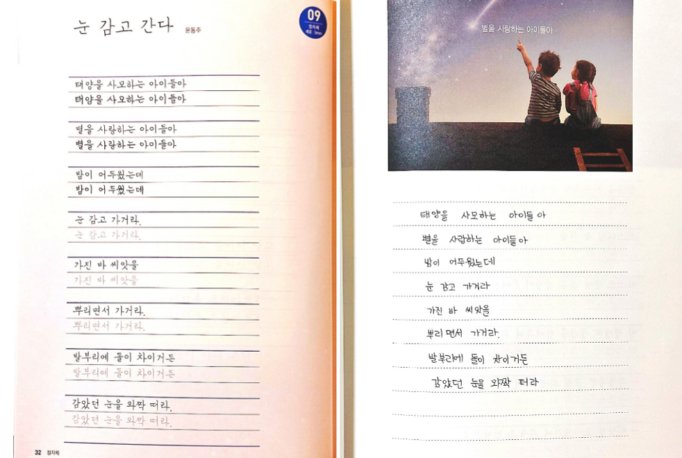 정자체 필사에 선택된 시인은 윤동주! 별 헤는 밤, 서시 등의 대표적인 시들도 나와 있었지만, 개인적으로 함께 수록된 사진이 마음에 들어서 '눈 감고 간다'는 제목의 시를 먼저 필사해 보았어요.