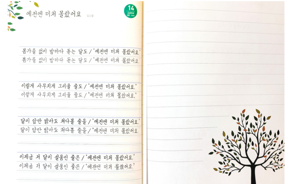 <예쁜 손글씨에 아름다운 시를 더하다>를 읽어보았어요. <예쁜 손글씨에 아름다운 시를 더하다>책은 윤동주, 김소월, 정지용, 이육사 등의 시를 읽고 필사할 수 있는 책인데요.