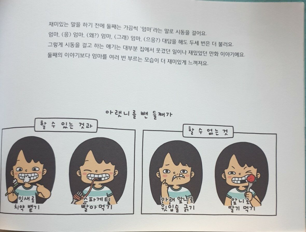 남매의 일상을 섬세하게 관찰하고 순간을 만화 형식으로 기록하고 작가님만의 생각을 담아 브런치에 연재하여 제10회 브런치북 특별상을 받았습니다. 그림책이라고 하기엔 꽤 많은 페이지로 되었지만 천진난만한 남매의 일상을 보다 보면 시간 가는 줄 모르게 보게 됩니다.