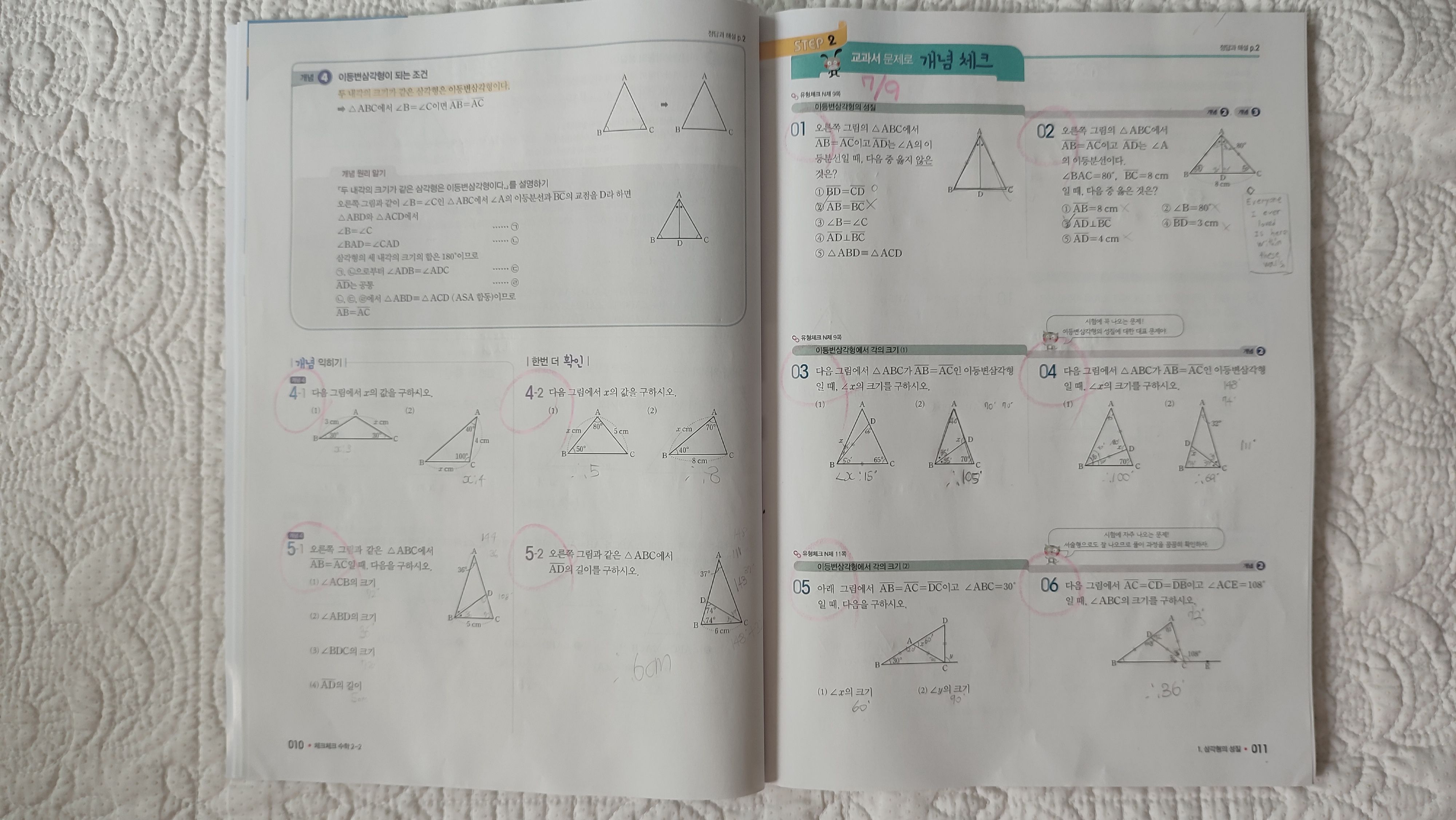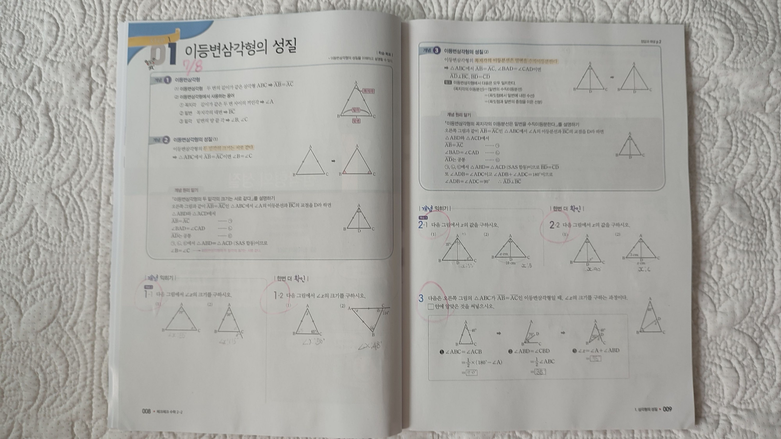 이등변삼각형의 성질에 대한 개념들을 읽고 막힘없이 문제들을 풀어주네요.