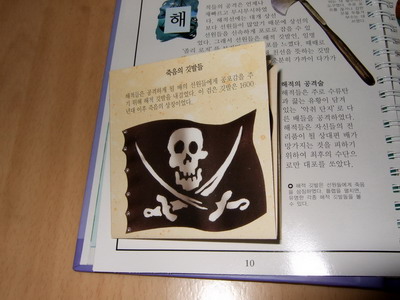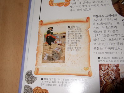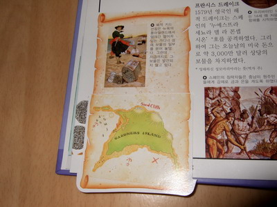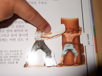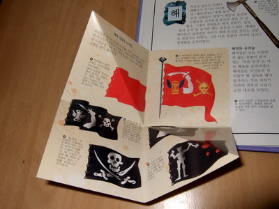 사실적인 묘사와 설명이 돋보이는 책 입체 자연 과학 탐험 PLUS !! 그 중에서 내가 본 책은 "해적"이다 책 크기는 17*25 정도로 크지는 않은 편이다. 대량으로 찍어내는 책들과는 다르게 일일이 수작업을 해야하는 플랩과 탭, 돌아가는 그림이 들어 있어서 꼼꼼하고 섬세하게 만들어졌다..그래서 좀 옛날 책을 보는 것 같은 느낌이 살짝 있기도 했다.. 마치 보물지도를 말았다 펼쳐보듯이 만들어져 있다. 보물상자 안에 뭐가 들어 있나 열어보는 재미.. 아이들의 흥미를 자극하는 데 그만이다 해적 하면 절대로 빠질 수 없는 해골 표시 깃발!! 북아트 만들듯 귀퉁이에 종이접기 해서 아기자기하게 붙여져 있다 아쉬운 점이 좀 있다면... 지면에 충실하다보니 설명이 좋지 않는 곳이 몇 군데 있었다. 예를 들어 "해적의 다른 이름"을 소개하는 장에서 어떤 이름들이 있었는지 설명식으로 문장속에 띄엄띄엄 나열되어 있어서 작은 글씨들을 모두 읽지 않으면 알 수가 없었다. 플랩이나 탭이 들어가서 아무래도 지면 활용에 여유가 없었던 것 같다. 또 주제가 해적이다 보니 어린이가 보기엔 너무 잔인한 장면들이 있었다 고문하는 장면을 그림으로 나타내어서 한눈에 알아 볼 수 있게 하고 채찍으로 사람을 때리는 장면을 아이들이 스스로 체험할 수 있게 할 필요는 없지 않았을까 생각한다 아이들이 책을 읽으며 자기들이 해적인양 선장님이라고 부르며 즐거워 했다. 세계에서 가장 악명 높은 해적 6명의 소개를 돌아가는 그림으로 표현한 곳이 있었는데 아쉽게도 사진이 잘 안나와서 첨부를 못했다. 이 외에도 자연과학 탐험책이라 사실적이고 구체적으로 잘 나와있는 장면들이 많고 비닐로 책 장 사이를 들춰보게 되어 있어서 아이들이 정말 좋아했다.