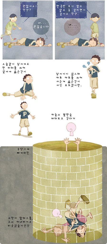그렇습니다. 책을 많이 읽는 것도 좋지만, 바른 자세로 읽는 것 또한 중요합니다. 누워서 읽을 수 있는 책은 많습니다. 시간을 죽이기 위해 집어드는 책도 부지기수입니다. 목차만 훑어보아도 필요한 정보를 파악할 수 있는 책도 많습니다. 다 좋습니다. 하지만 퇴근길 버스 속에서 아이의 글씨를 보고 자세를 반듯이 하는 저 시의 화자처럼 척추를 곧추세우고 읽어야 하는 책이 있습니다.