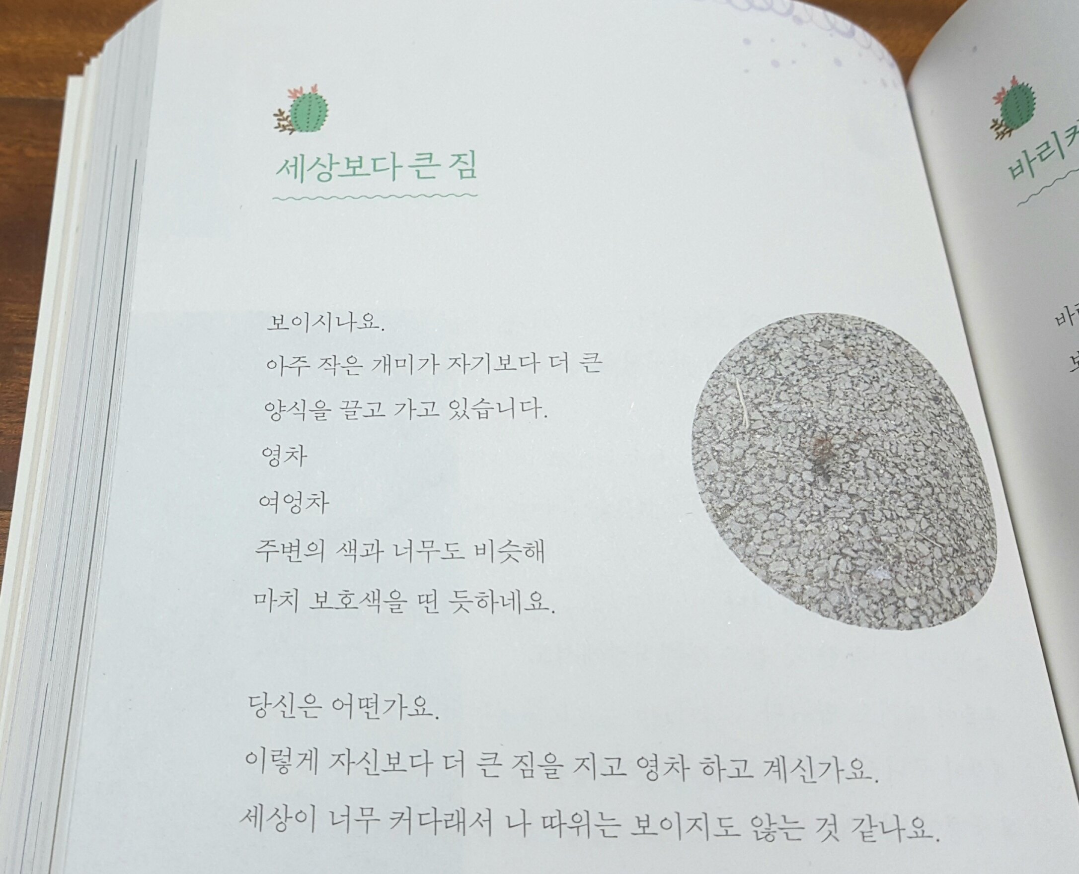 정말 주변에서 신경을 곤두세우고 관찰해야 볼 수 있는 작은 개미를 보며 저자가 전하는 이야기입니다. 이 책에서는 저자가 일상에서의 작고 사소한 것들이더라도 잘 관찰하여 그를 통해 얻은 깨달음을 전해주고 있어요. 주변에 대한 저자의 섬세한 관심이 돋보이는 부분이었죠.