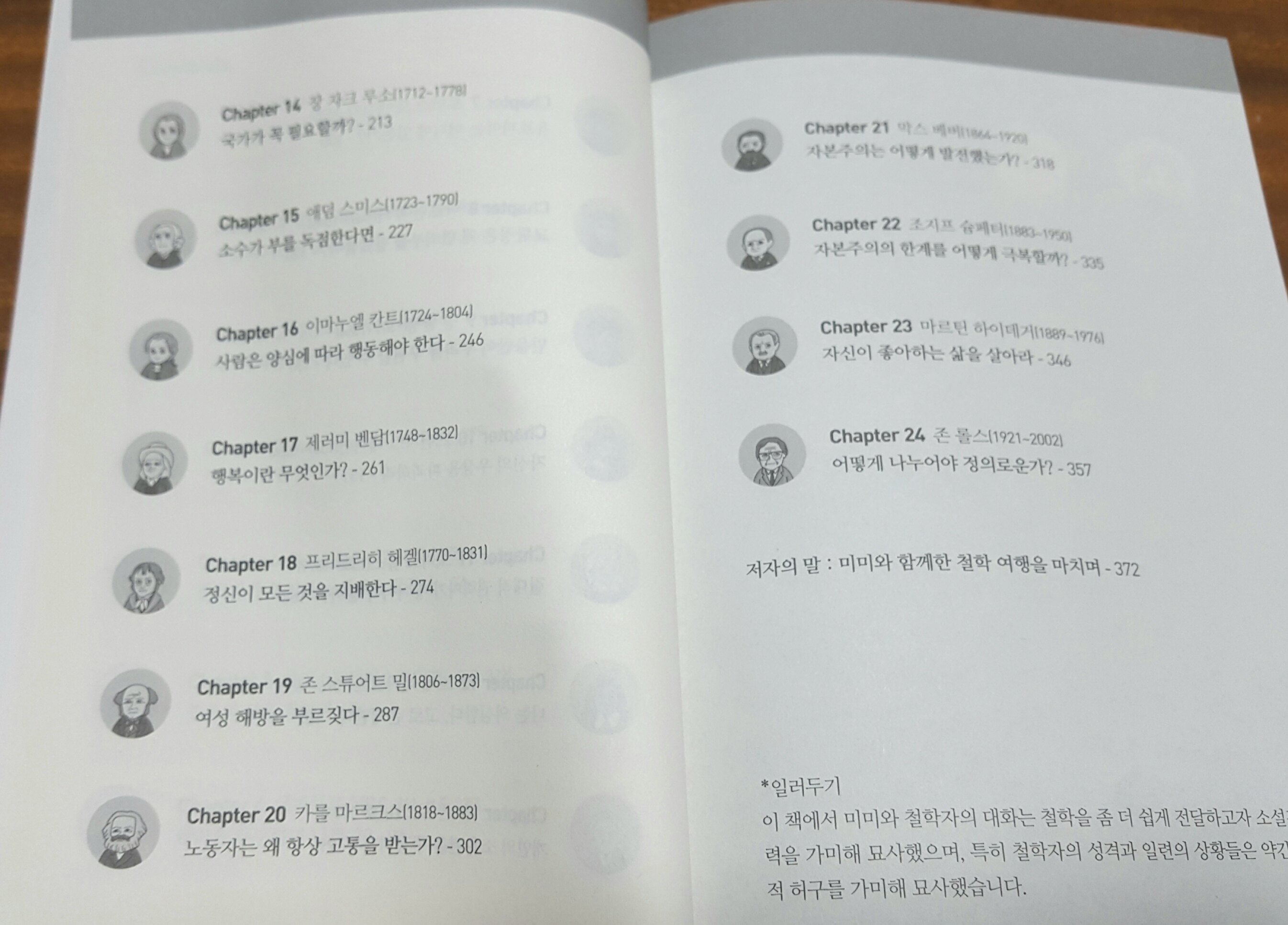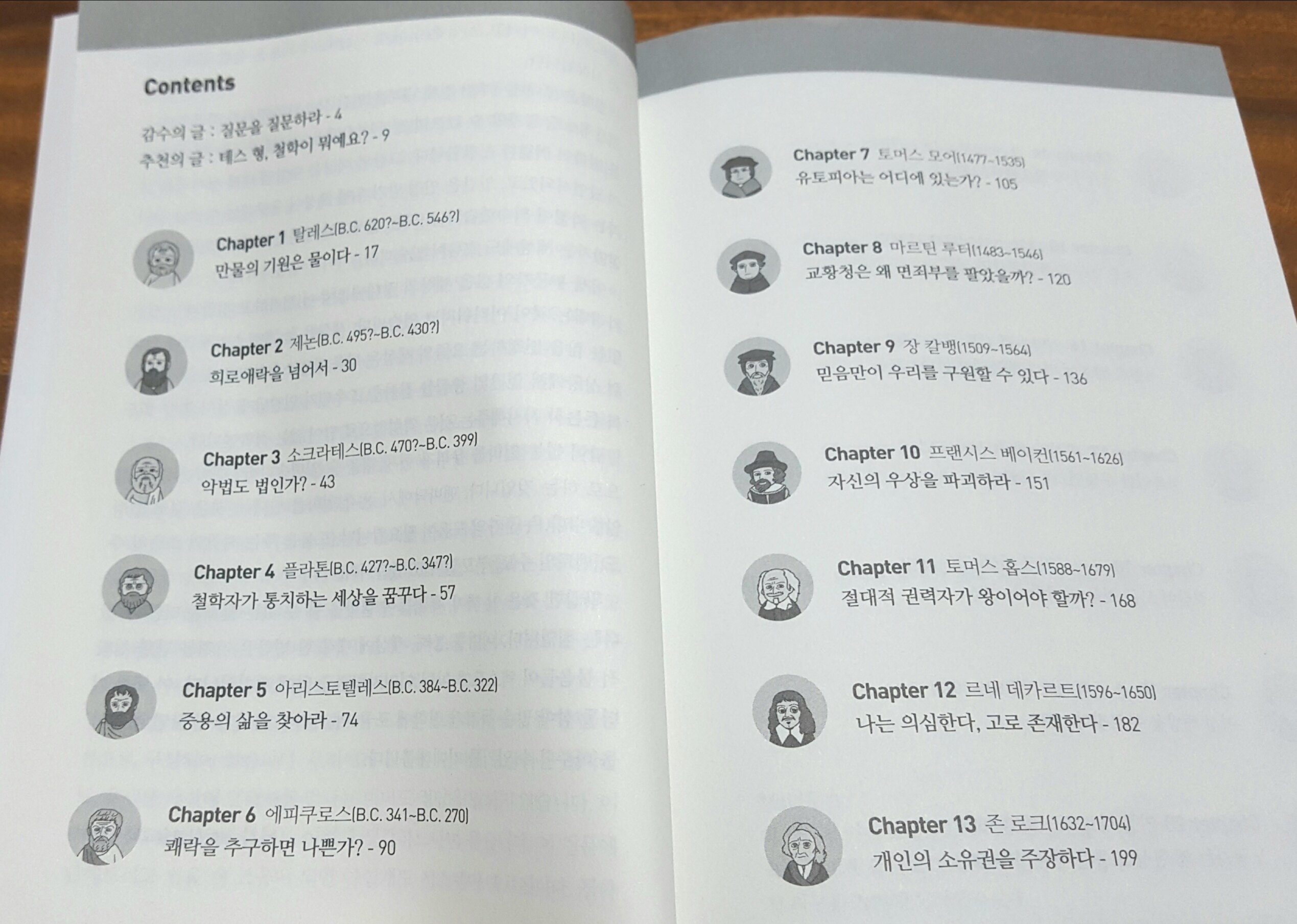 ‘감수의 글’, ‘추천의 글’을 시작으로 총 24개의 챕터에서 24명의 각 철학자와의 대화를 통해 철학을 색다르게 만나볼 수 있고 그 후 ‘저자의 말’로 마무리가 됩니다.