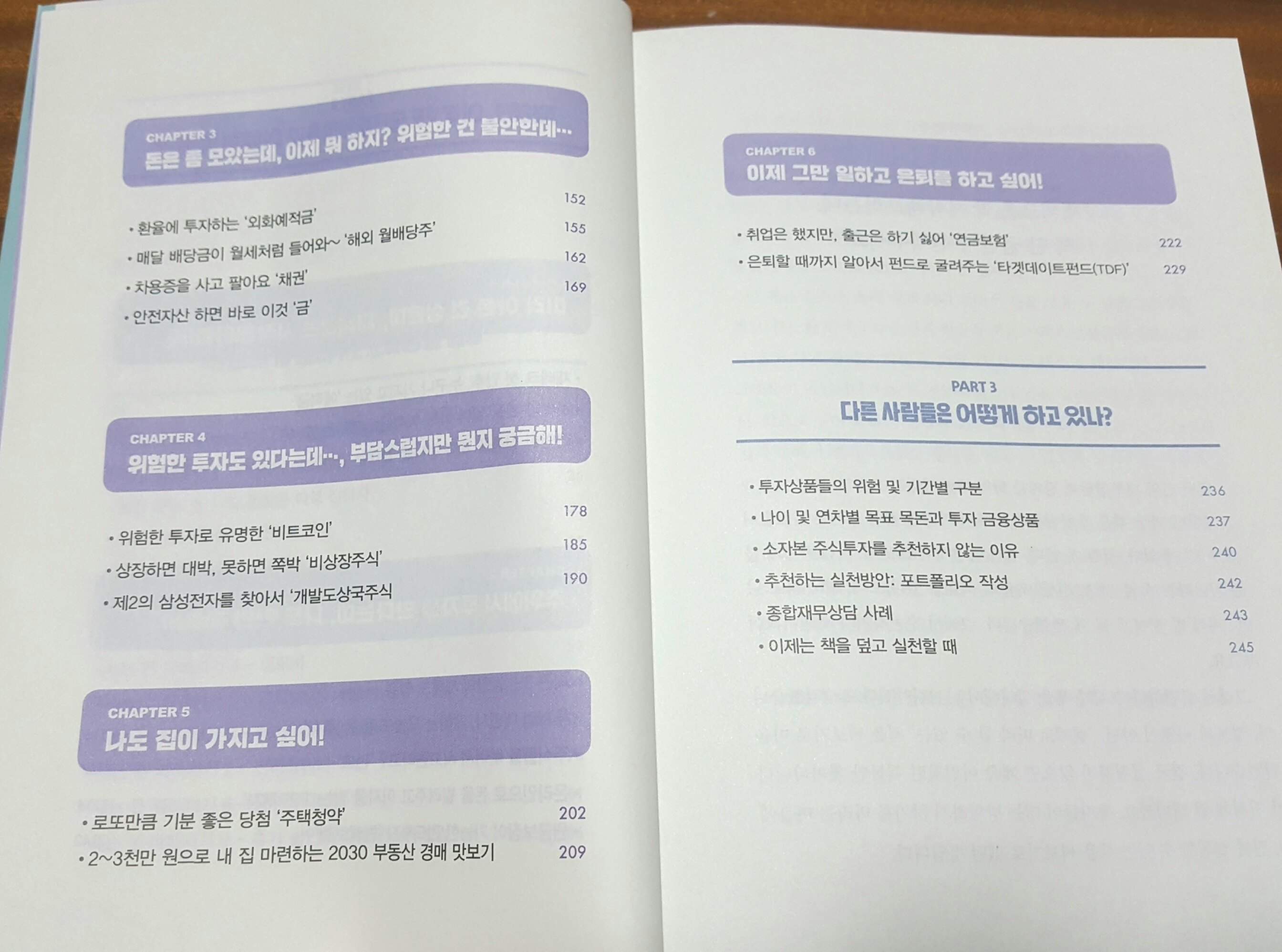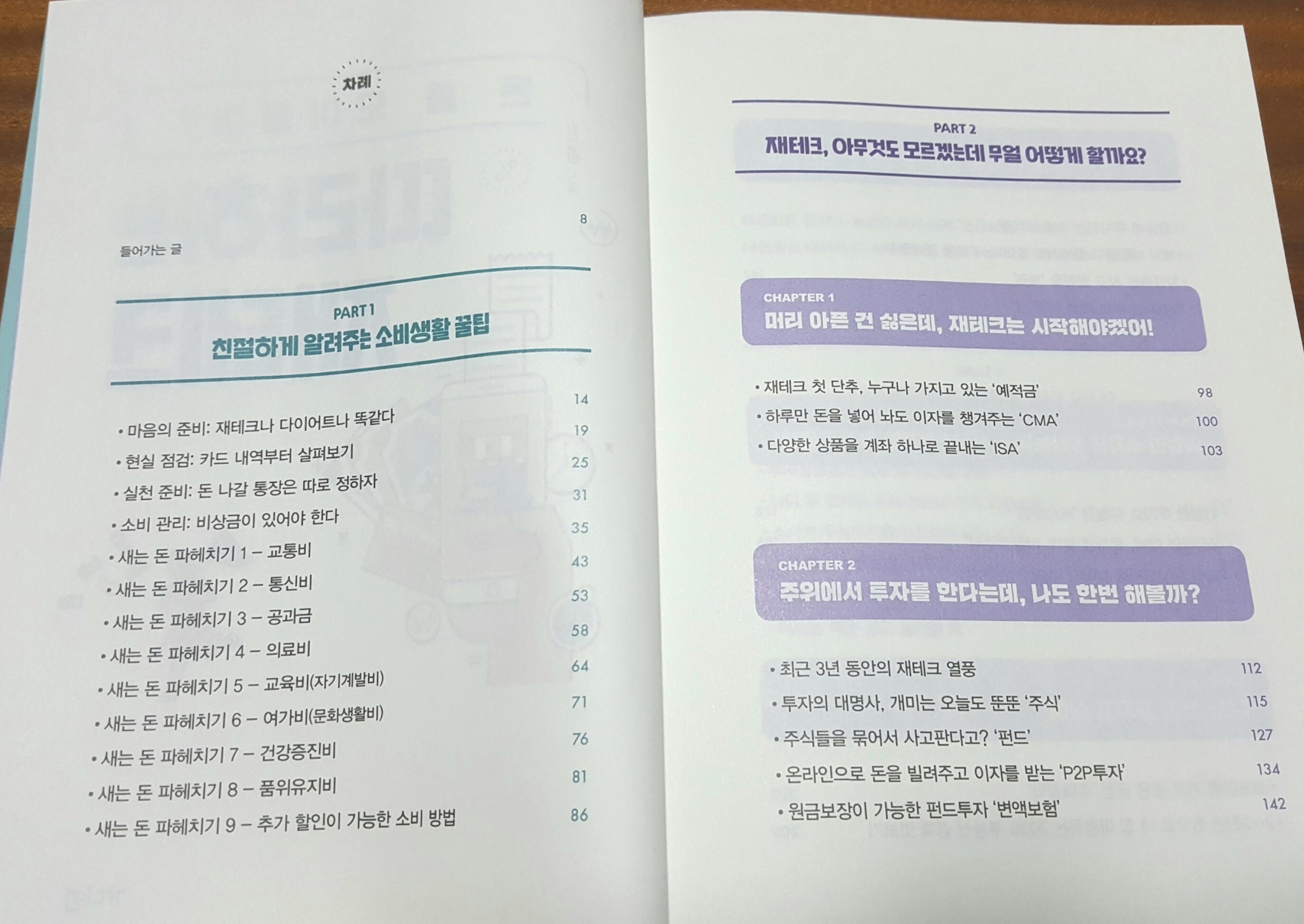 ‘들어가는 글’을 시작으로 크게 3개의 파트로 나뉘어 재테크에 대한 내용이 자세하게 나옵니다. 특히 ‘PART 2’에는 다시 6개의 챕터로 나뉘어 주요 재테크 정보들을 설명하는게 눈에 띄네요.