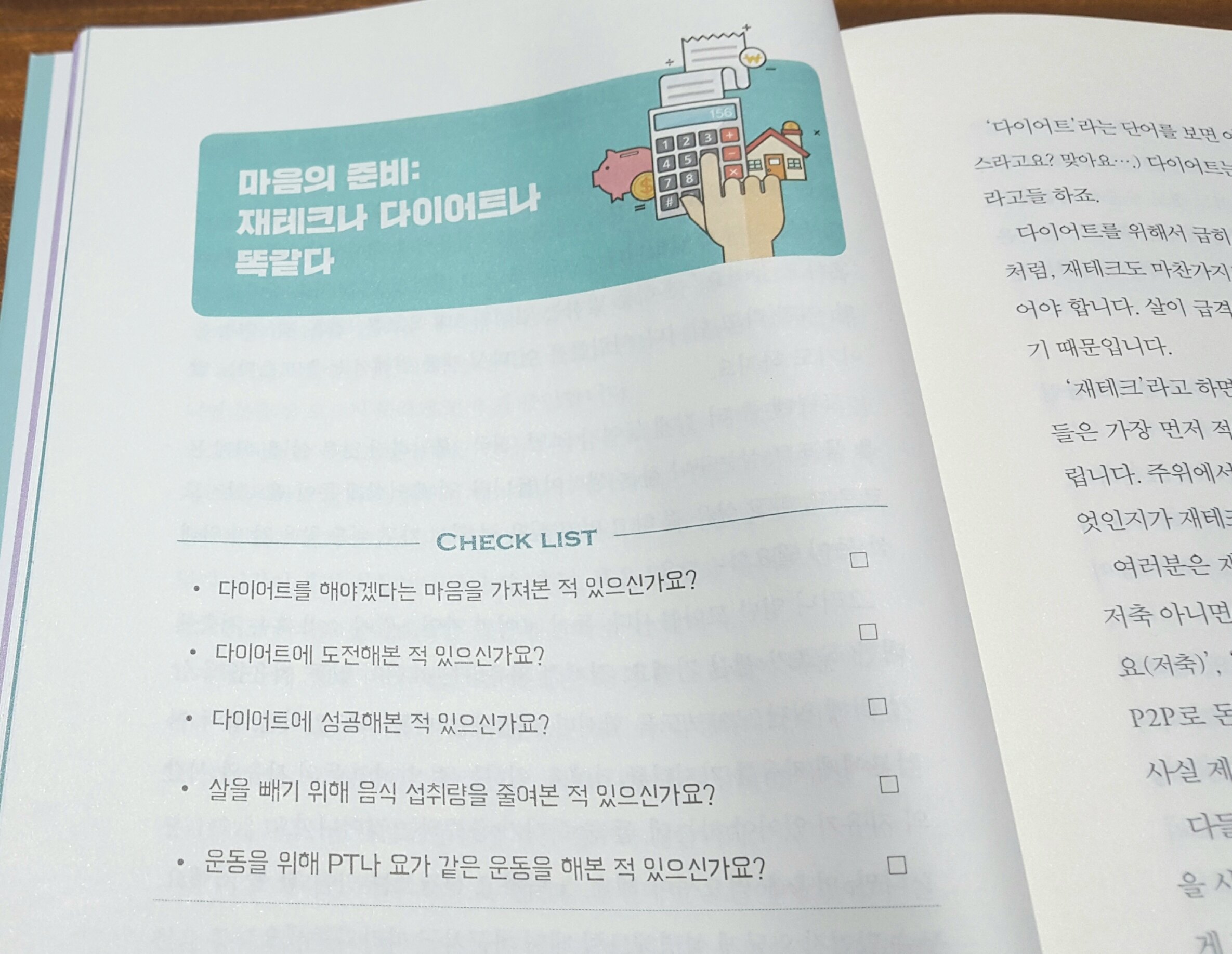이 책에서 재테크를 이해시키기 위해 시도하는 처음의 이 접근이 좋았어요. ‘재테크’라는 어려워보이는 것을 흔히들 하는 ‘다이어트’에 비유해서 말이죠. 왜 저는 평소에 다이어트는 밥먹듯이 다짐하고, 시도하고, 실천하면서, 재테크는 생각만 하거나 꾸준히 실천하지 못해왔을까요.