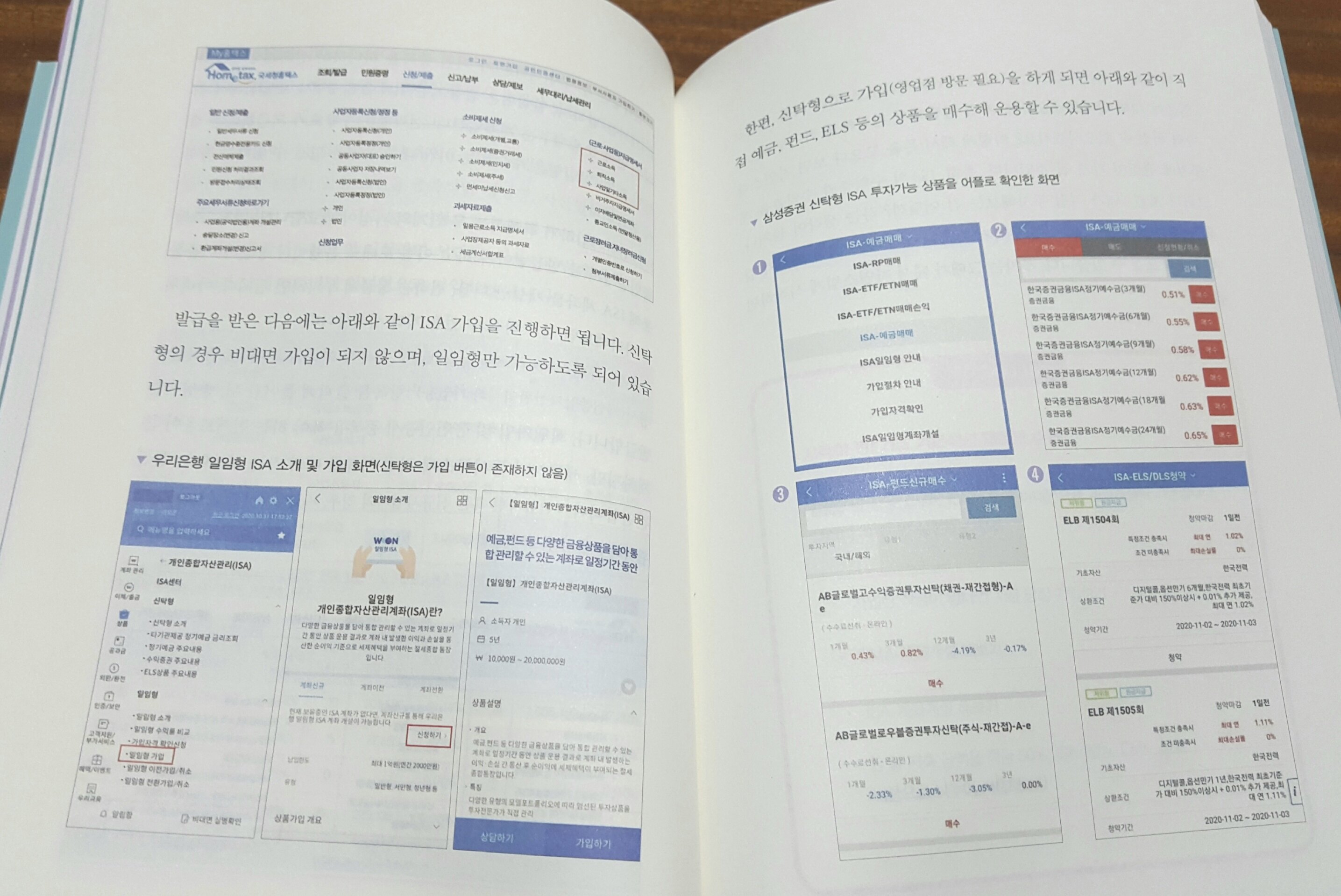 생전 처음 들어보는 ISA라는 것이었는데요. ‘개인종합자산관리계좌’라는 뜻으로 자산관리를 위한 계좌를 만들어 돈을 넣고 원하는 상품에 투자하는 개념이라고 해요. 위와 같이 이 책의 곳곳에서 이렇게 자세하게 가입 방법까지 알려주고 있는 것처럼 사진 설명이 잘 되어 있어요.