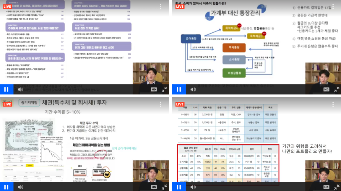 이 책을 읽어보면서 아직 많이 부족하긴 하지만 그래도 재테크의 개념이 어느 정도 잡힌 느낌이 들었어요. ‘재테크의 세계는 정말 무궁무진하구나..!’ 하는 생각이 들기도 했구요. 게다가 책과 live 클래스까지 들을 수 있어서 좋았죠. 전문가가 직접 재테크와 관련된 알짜 정보들을 콕 찝어 알려주니 유익한 기회였습니다.