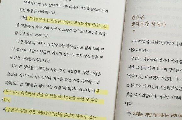 기사에서 저명인사(?)들이 장수하는 기사들을 보며, 100세시대구나 생각만했지, 미처 몰랐다, 주위 소중한 분들이 나이 들어가고 있었음을. 내 나이도 딱히 생각 안하고 살고 있었기 때문에. TV에서 어린 시절 좋아했던 연예인들 얼굴이 자글자글해짐을 75인치로 큰 화면으로 확실하게 느끼며;; 이제 드라마 볼 때 인물 피부만 보고 있는데;; 아니 모라고 하고 있는거야;; 아무튼 소중한 가족 친지 어르신들의 세월을 잊고 살았다. 내 행복만 돌아볼 게 아니라, 어려운 시절을 겪으시고, 행복을 모르고 참고 살아오신, 자신의 행복을 챙기지 못하는 분들을 챙기고 싶다는 생각이 들어 이 책을 읽게 되었다. 읽으면서 내 기나긴 미래, 먼 미래를 위한 준비도 천천히 해야겠다는 생각도 문득.