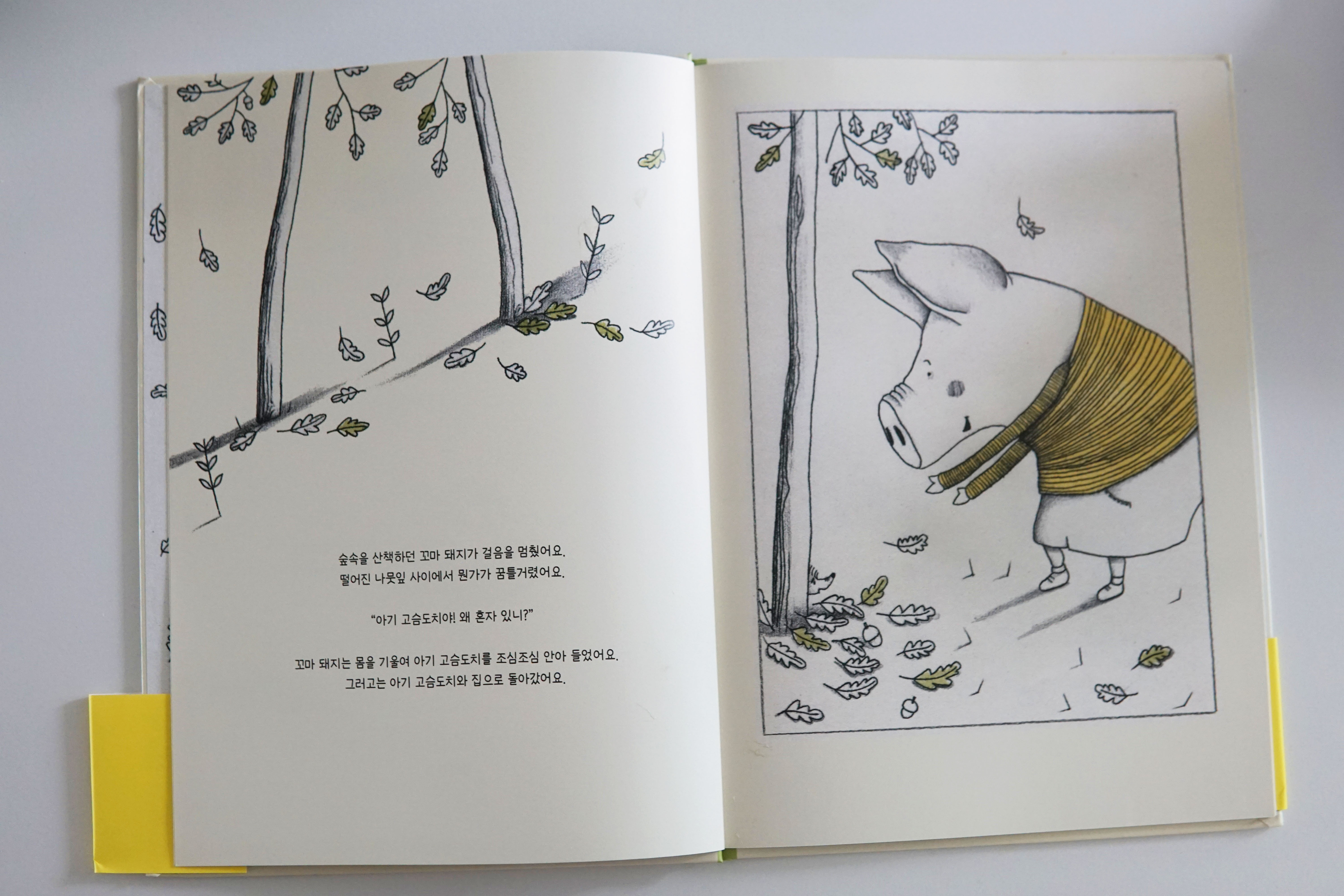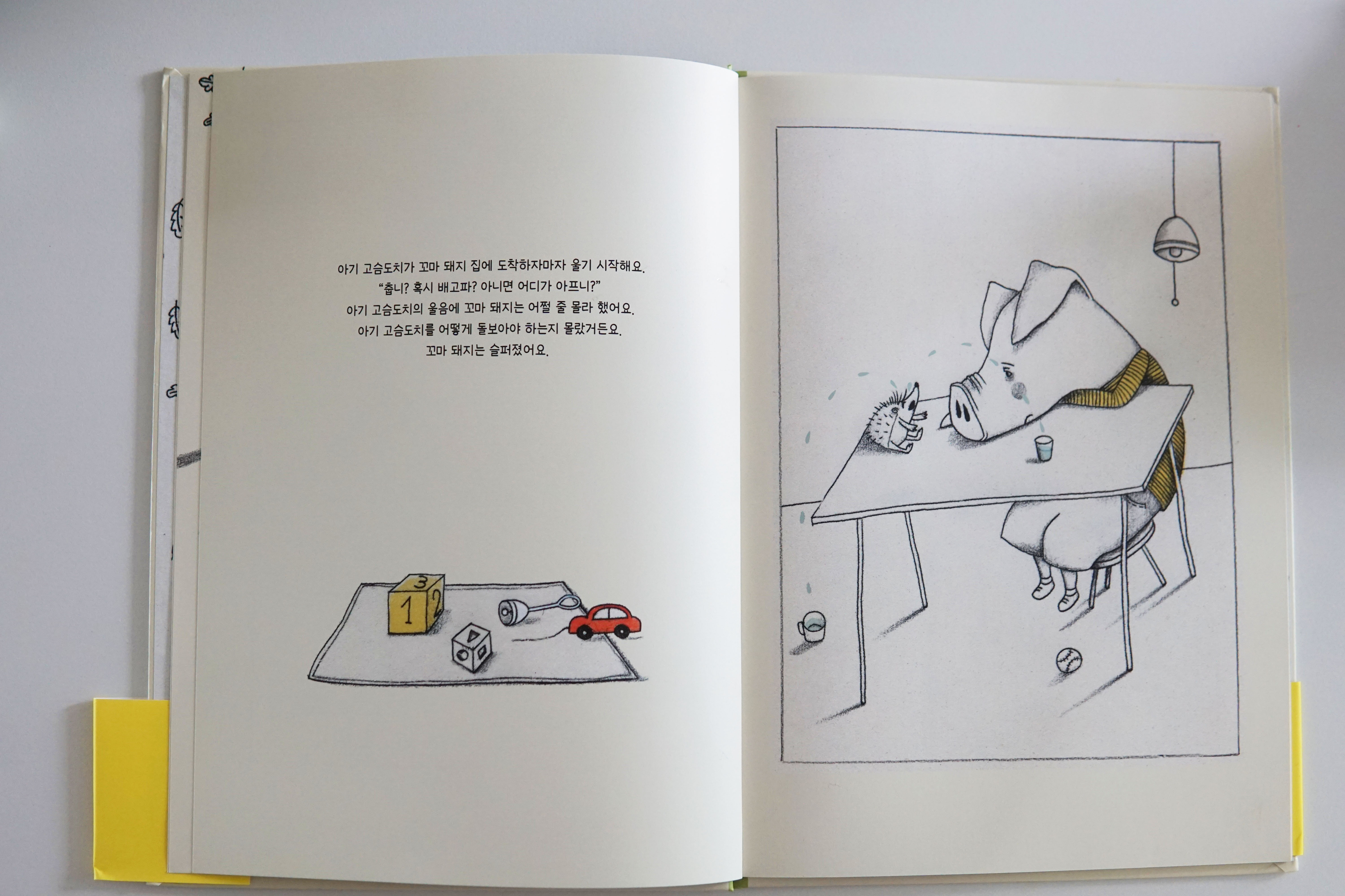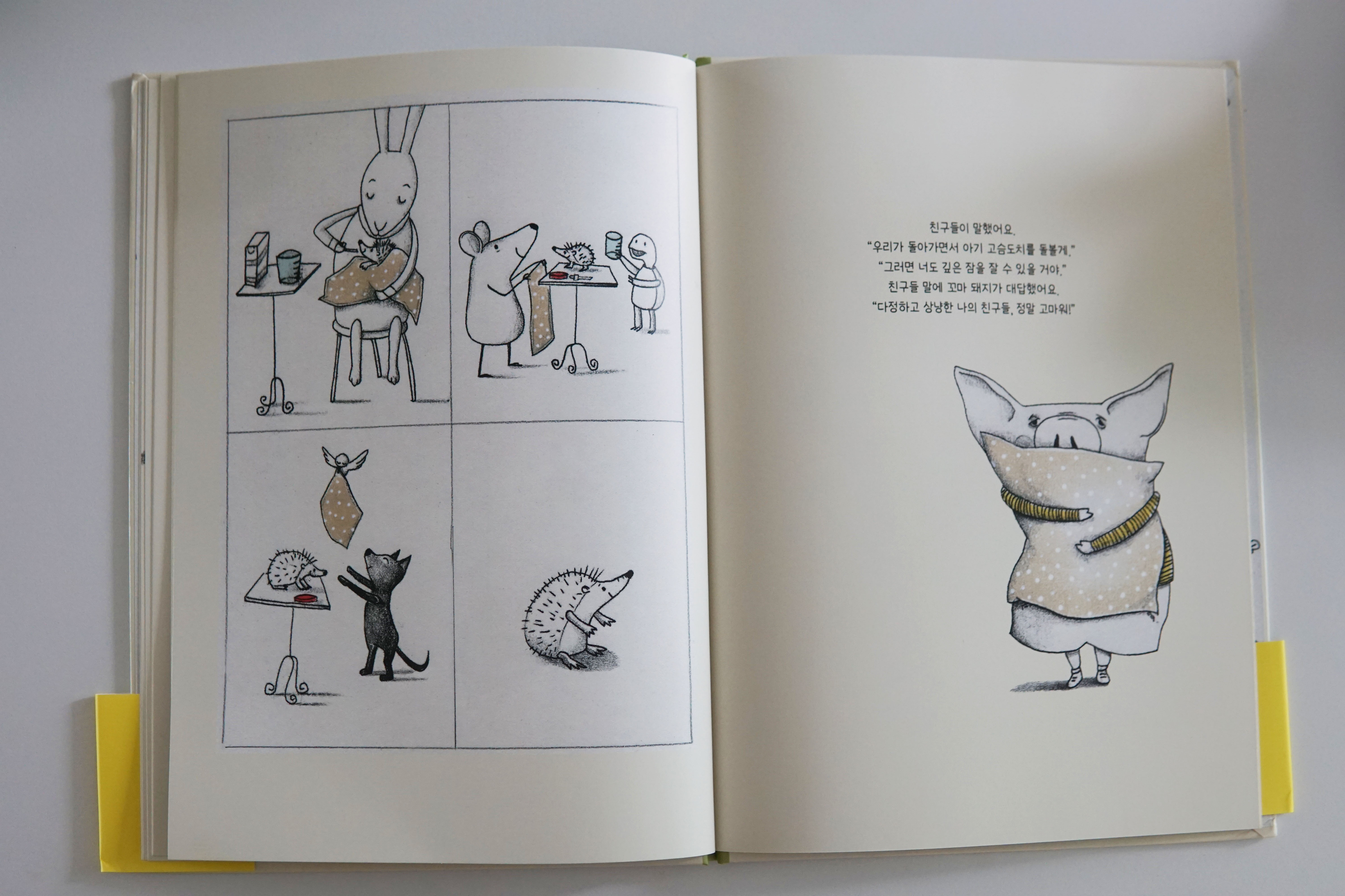 돼지와 고슴도치가 살포시 웃고 있는 표지가 인상적인"넌 나의 행운이야"이다.넌 누구고 나는 누구일까둘 중 누가 누구에게 행운일지 생각해보며아이들과 함께 읽어보았다.넌 나의 행운이야 줄거리꼬마돼지가 숲속에서 아기 고슴도치를 발견한다.아기 고슴도치는 지쳐있고 배가 고파하고 슬퍼하는 상태다꼬마 돼지는 고슴도치를 돌볼 줄 몰라눈물을 글썽거린다 꼬마 돼지는 의사 선생님을 찾아가 아기 고슴도치에게 필요한 것들에 대해 듣고 온다집으로 돌아온 꼬마 돼지는 고슴도치를 기쁜 마음으로 돌보기 시작한다신생아가 태어나면 밥을 수시로 먹는다한달 전후로 텀이 잡히면서 3~4시간 텀이 벌어지기 시작한다엄마 아빠는 초인적인 힘으로 아이를 돌보며 키워낸다아기 고슴도치는 한달정도 된 아기와 같다스스로 밥을 먹지 못하고 3시간에 한번씩 우유를 줘야 한다말이 3시간에 한번이지우유를 주기 위해 우유를 타고,먹이고 소화시킨다음 재우고자는 사이에 우유병 설거지를 하고 나면거의 쉴틈이 없다꼬마돼지는 점차 지쳐간다고슴도치는 예쁘지만 꼬마 돼지는 너무 힘들다그런 꼬마 돼지를 도와준 것은바로 다른 동물 친구들이다아이는 온 마을이 함께 키운다더니꼬마 돼지와 고슴도치의 사정이 딱 그 짝이다고슴도치는 마침내 무럭무럭 자라독립을 하게 되고이따금 찾아와 함께 잠을 잔다누가 누구에게 행운이었을까?일단 아기 고슴도치는 꼬마 고슴도치를 만나건강하고 안전하게 클 수 있었으니 꼬마 돼지는 고슴도치에게 행운이었을 것이다꼬마 돼지 또한 고슴도치를 키워내는 과정에서사랑과 성취감, 장성한 자식(?)이 사랑을 가득안고 돌아오는 기쁨을 얻었으니그 또한 행운일 것이다고슴도치와 꼬마 돼지에게 무엇보다 큰 행운은그들이 지쳤을 때 도움을 줄 수 있는 다른 친구들일 것이다행운이 모여 행복이 되었다돌봄과 지지가 만들어 낸 기적을 담은 이야기"넌 나의 행운이야"이다.[출판사로부터 도서 협찬을 받았고 본인의 주관적인 견해에 의하여 작성함]