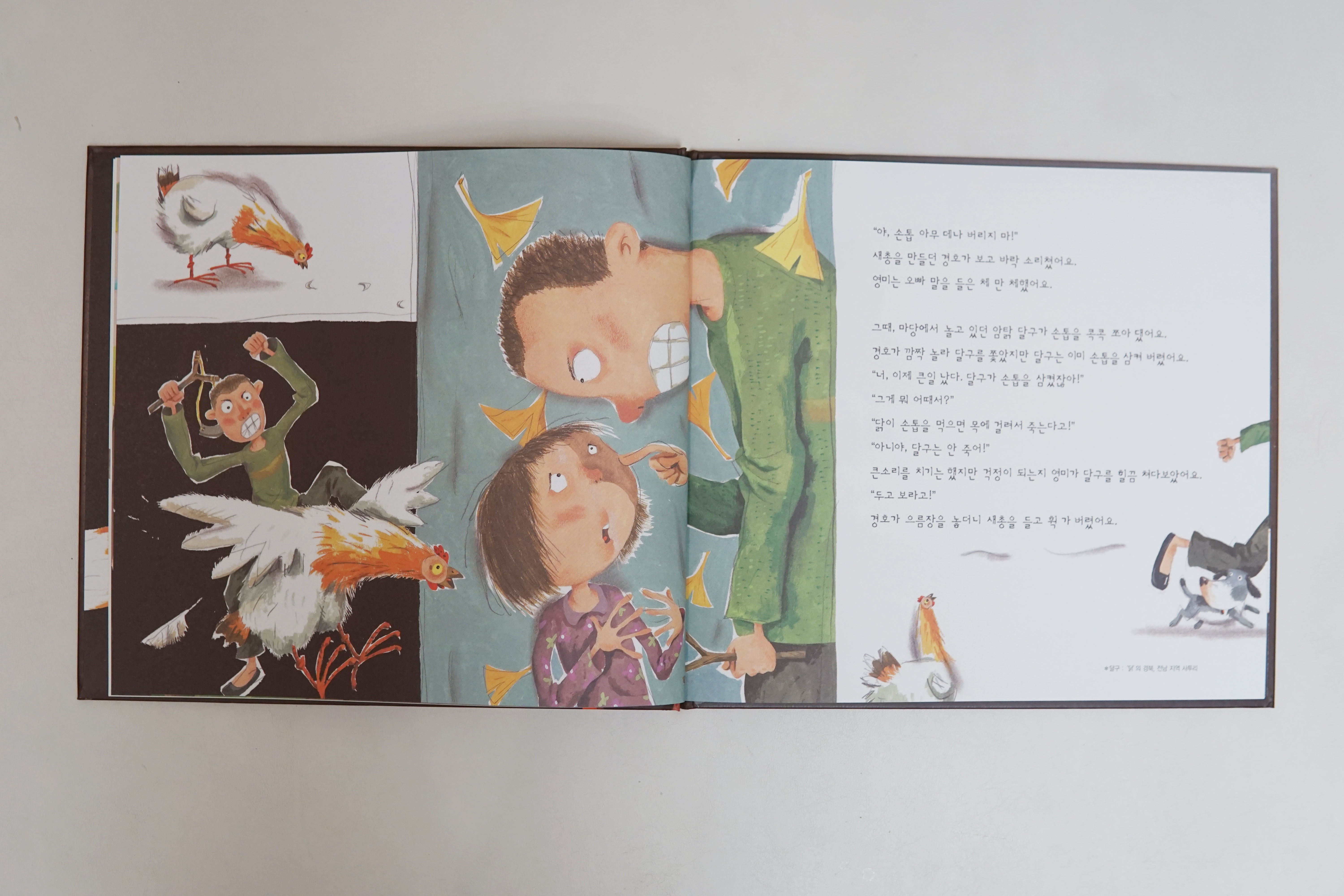 손톱 하면 떠오르는 전래동화는 바로 옹고집이다손톱을 함부로 버렸더니 쥐가 먹고 가짜 옹고집으로 변신해진짜 옹고집은 쫓겨난다는 이야기는아이들에게 손톱을 잘 관리하고 모아서 버리도록 교훈을 준다.그 교훈의 효과가 떨어질 무렵달구와 손톱을 만나보았다옹고집보다 좀 더 가까운 시절에오싹오싹한 분위기가 더 해져 무척 집중해서 보았다.달구와 손톱 줄거리영미와 경호는 남매다어느날 영미는 툇마루에 앉아 손톱을 깎고는마당으로 던져 버린다그 모습을 본 경호는 집에서 기르는 닭, 달구가 먹고 죽을 수 있다며 화를 낸다때마침 달구가 손톱을 먹어 버리고겁이 난 영미는 달구가 죽지 않길 바라며 별 수를 다 쓴다경호는 영미가 여전히 괘씸한지영미를 향해 손톱을 먹고 죽은 닭은여우가 된다며 경고처럼 말하고 간다그리고 그날 밤세상에나 마상에나정말 여우 소리가 들린다손톱을 먹은 달구가 여우가 되었다며영미방으로 찾아오고영미는 소스라치게 놀라 거의 기절할 지경에 이른다다행이 영미 부모가 소란을 듣고 방으로 오고여우는 달아나버린다아우우~~ 하는 여우 소리를 잘 흉내내어 읽으면전설의 고향 저리가라의 분위기를 만들 수 있다다만 부작용은 아이가 여우귀신을 용감하게 무찌르려고책을 두들겨 때린다는 것이다 일단 책 끝까지 가면 여우가 된 달구의 정체가 밝혀지기에그 다음부터는 여우 흉내를 내도난 네가 누군지 알지~ 하며의기양양하게 읽는 모습을 보인다.아이들이 좋아하는 으스스한 분위기,손톱에 관련된 민간신앙과 여우가 잘 어우러져알면서도 몇번을 다시 보게 된다이 책에서 전하고자 하는 메세지는 하나는 손톱을 함부로 버리지 말자이고또 다른 하나는 옛 시골에서의 삶의 모습일 것이다영미와 경호 남매, 달구와 여우로 그 메세지가 잘 전해지는 이야기달구와 손톱이다.?[출판사로부터 도서 협찬을 받았고 본인의 주관적인 견해에 의하여 작성함]