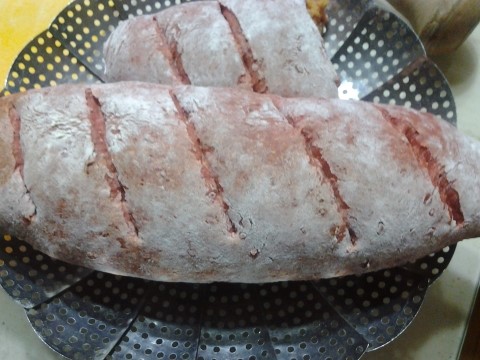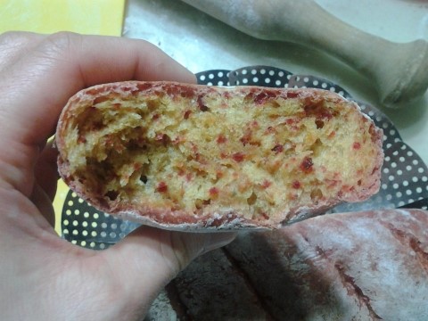 나온 바게트에는 비트뿌리를 갈아서 넣었어요. 비트가 들어가면 색이 정말 예술이에요. 빨간색을 내고 싶을때는 꼭 비트를 넣어주세요!