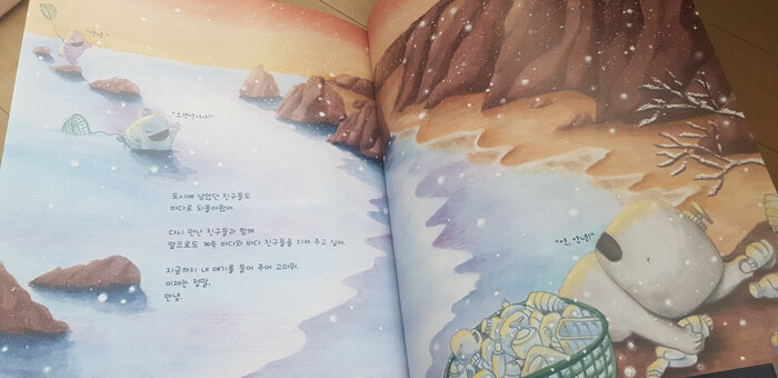 그림에 나오는 장면은 실제로도 봤었던 가슴아픈 장면이네요. 거북이나 갈매기의 코에 빨대가 꽂혀있다던지, 발에 그물이나 비닐이 휘감겨있다던지 하는 사진들을 가끔 접해보셨을거예요. 이 동화는 그런 가슴아픈 장면들을 동화적인 그림체로 아이들에게 전달하고 있습니다. 우리가 함부로 버리는 쓰레기들이 결국은 흘러흘러들어가서 바다동물들을 아프게 한다는 사실을 아이들도 이제 알겠죠?
