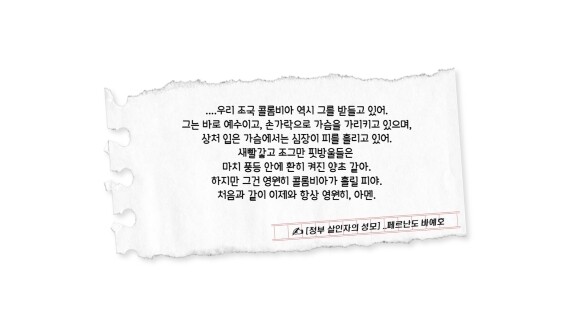 범죄와 살인, 부패와 폭력이 난무한 콜롬비아가 다시 예전의 콜롬비아로 돌아갈 수 없음을, 돌아간다해도 상처 받은 그들이 다시 예전의 행복을 찾을 수 없음을 페르난도를 깨달았기에 삶이 의미없다고 느낀 것이다. 그의 좌절이 잔인하게 들리지만 사실을 말하는 것이기에 더 많은 생각을 하게 한다.