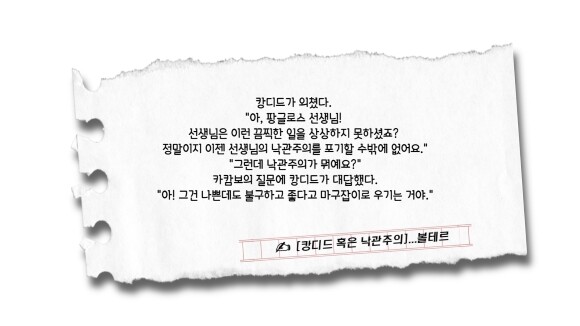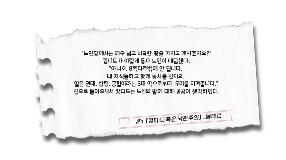 엘도라도에 머물러서 사는 것이 어떨까 잠깐, 아주 잠깐 고민하던 캉디드는 자신이 경험한 이곳을 타인에게 과시하고, 자랑하고 싶어 또다시 길을 떠나기로 결심한다. 결국은 손에 잡을 수 있는 행복을 사소한 욕심과 알량한 으스댐을 위해 포기한 것이다. 이 얼마나 미련하고 한심한 행동인가. 가진 것에 만족하지 못하고, 타인의 부러움을 자양분 삼아 살아가야 더 행복하다고 느끼는 얄팍한 우리 인간의 한심한 모습을 잘 보여주고 있다.