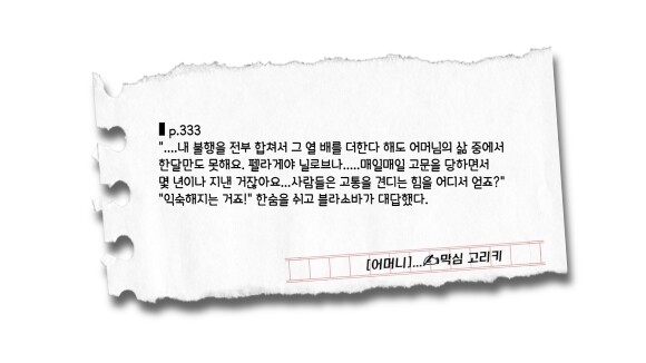 막심 고리키는 왜 사회주의 리얼리즘 소설의 주인공을 여성인 어머니로 설정했을지 궁금해졌다. 가장 취약하고 억압받는 대상이기 때문일까? 가정이라는 작은 사회 안에서 절대권력을 가진 유일한 대상이 절대약자인 다수의 구성원들을 대하는 폭력성을 통해 사회 속 약자들의 어려움을 독자가 더 실제적으로 느끼게 하기 위함임을 예상해 본다. 아이러니하게도 가정 안에서는 절대권력을 가진 강자였던 남편 블라소프는 조금 더 확장된 사회인 공장에서는 가장 취약하고 약자인 착취당하는 노동자가 된다는 것도 생각해 볼 지점이다. 그는 착취의 부당함을 대항하여 개선하려는 노력이 아닌 자신보다 더 약한 존재들에게 화풀이함으로 해결한다. 이런 해결은 상황을 개선하지 못하고 오히려 모두가 불행해짐을 생각해 볼 수 있다. 아버지와 달리 아들 파벨은 자신을 착취한 대상을 향해 정면으로 소리친다. 올바른 자세이며 또다른 억울한 피해자를 만들지 않는 행동이다.