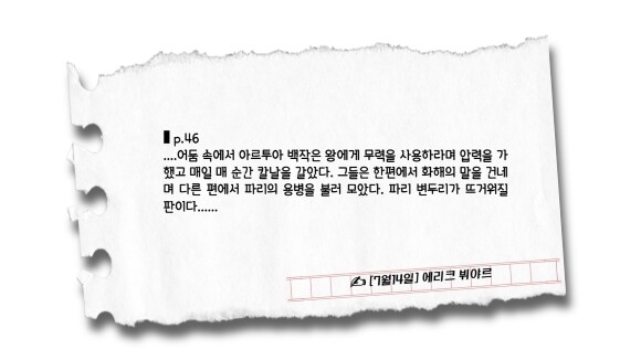 '바스티유를 습격한 폭도들은 도개교 문의 조금만 구멍에서 쪽지 하나를 보고 화들짝 놀랐다'(p.169)그들은 그 편지가 그들을 착취한 상대들의 사과 편지이길, 지난 날을 반성하며 앞으로 함께 나누자는 편지이길 바랬다. 하지만 군중은 절벽 저쪽에 있는 그 편지를 볼 수가 없었다. 과연 그 편지는 사과의 편지였을까? 사과의 편지였길 군중들이 바랬을 것이라는 묘사가 마음 아프다.
