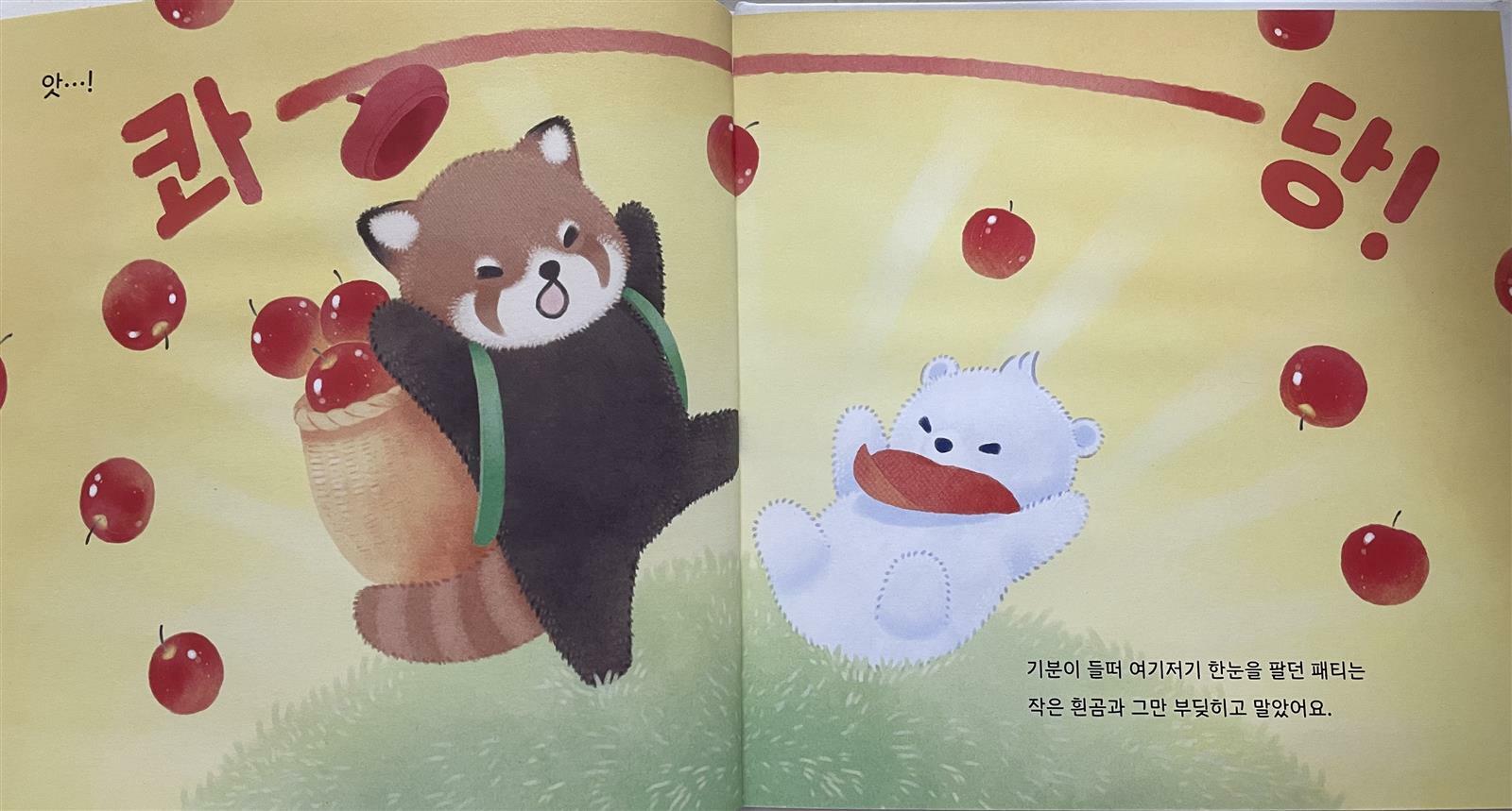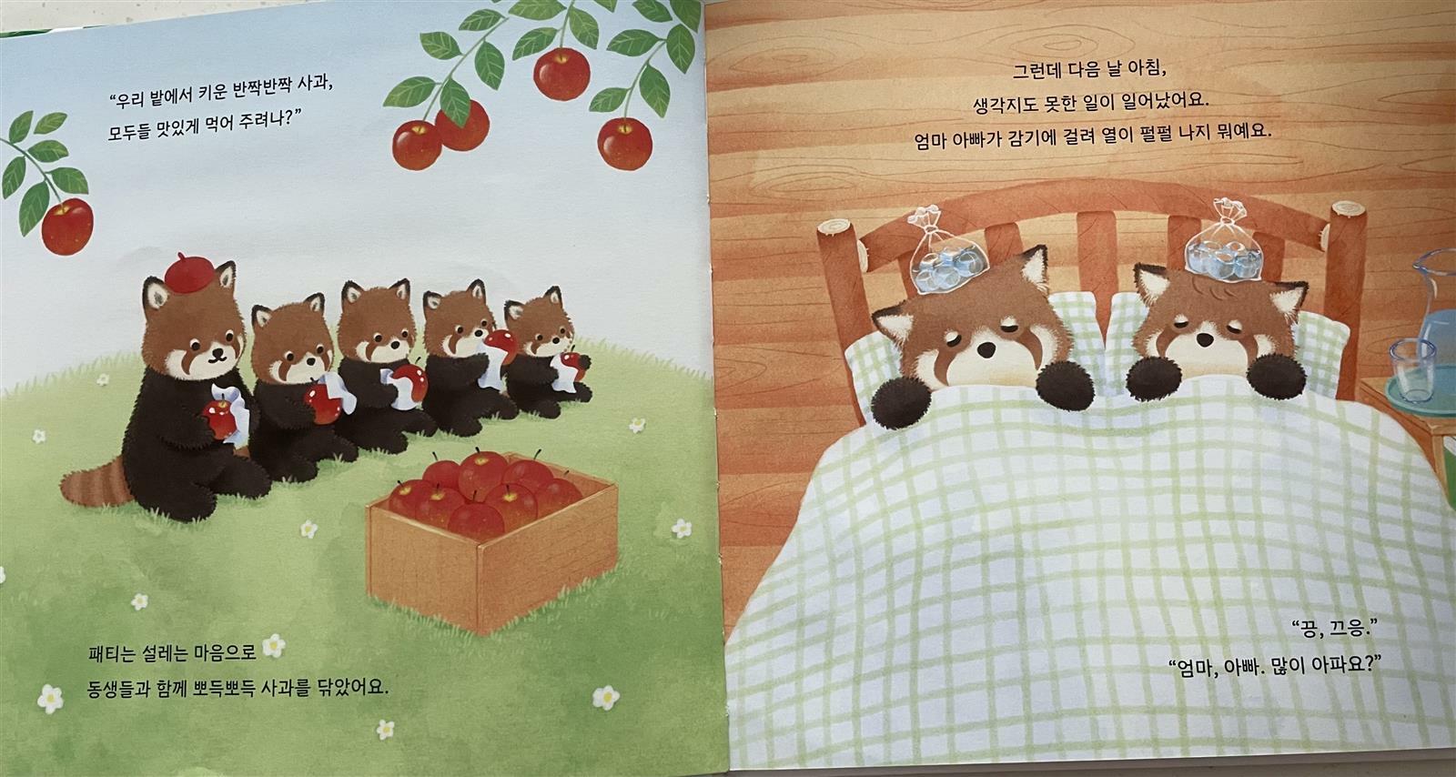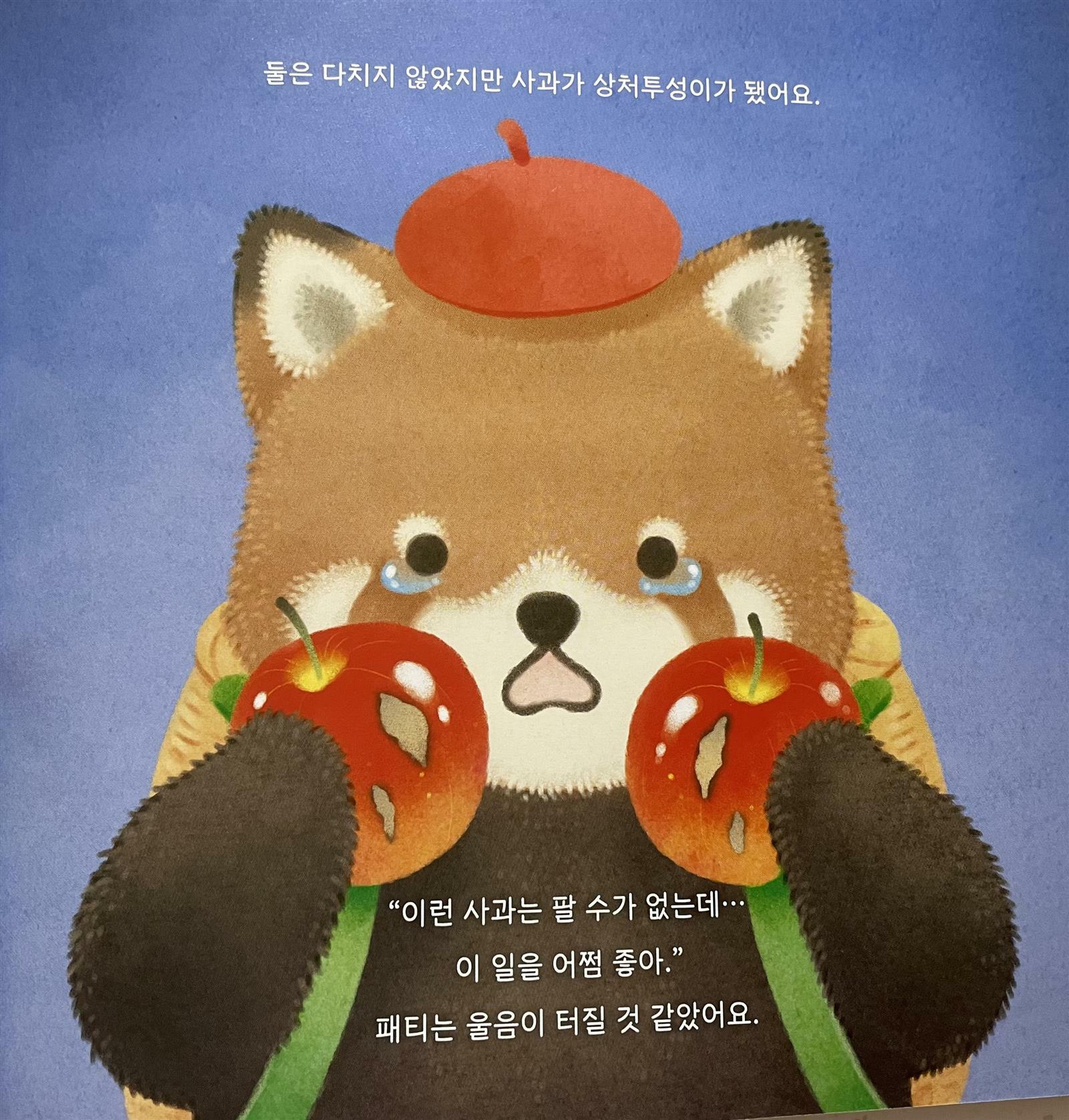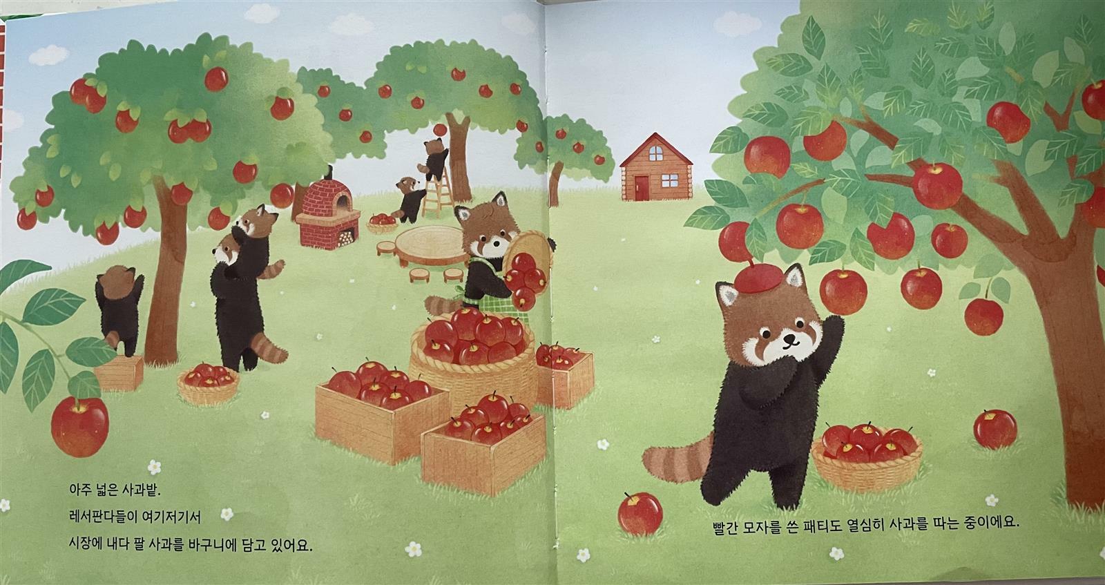과일을 그닥 좋아하는 아이가 아이기에 과일과 친해졌으면 하는 마음에서 읽은 또 다른 책이 있습니다. 다키노 미와코의 <사과밭의 레서판다>에요. 읽은 후에는 아이와 쿠킹하는 시간도 가질 기회도 되기에 더할나위 없이 좋은 책이더군요. 책 표지 가운데에 있는 레서판다는 주인공 패티에요. 처음엔 저는 사과를 머리에 얹고 있네? 생각했는데 빨간 모자라고 합니다(웃음) 아주 넓은 사과밭에서 레서판다들이 분주하게 사과를 따고 있어요. 빨간 모자를 쓴 패티도 열심히 사과를 따는 중입니다. 패티와 동생들은 밭에서 키운 사과를 정성스럽게 뽀득뽀득 닦으면서 설레고 있어요. “우리 밭에서 키운 반짝반짝 사과, 모두들 맛있게 먹어 주려나?” 그런데 다음 날 아침, 엄마 아빠가 감기에 걸려 열이 펄펄 납니다. 부모님은 패티에게 대신 사과를 팔러 시장에 다녀와 주기를 부탁하지요: 동생들은 아직 어려서 시장에 나갈 수 없거든요. 처음으로 혼자 시장에 가게 된 패티. 조금 걱정됐지만 왠지 모르게 가슴이 콩당콩당 뛰었어요: “알았어요. 다녀올게요!” 씩씩하게 버스를 타도 숲속시장에 도착합니다. 엇! 기분이 들떠 여기저기 한눈을 팔던 패티는 작은 흰곰과 그만 부딪히고 말아요. 둘은 다치지 않았지만 사과가 상처투성이다 되었지요. ”이 일을 어쩜 좋아.“ 패티는 울음이 터질 것 같았어요. 패티는 이 난관을 잘 극복할 수 있을까요? 패티의 첫 심부름은 쉽지 않았네요. 상처투성이 사과는 사과 그 자체로 상품을 팔 수가 없어 울상이던 패티가 이해가 되더군요. 레서판다들이 사과를 정성스럽게 키우고 따고 뽀득뽀득 닦던 모습을 생각하면 엄청 제가 더 안타까웠습니다. 그때 구세주(?)처럼 도와준 작은 흰곰의 형! 상처투성이의 사과가 상품이 될 수 없기에 사과를 파이 반죽을 이용해 사과파이를 만들어 줍니다. 중요한 건 실수 자체가 아니라 실수를 극복해 나가는 방법이라고 생각해요. 아이들이 상처받지 않도록 위로하고, 실수를 또 하나의 새로운 기회로 생각하게끔 이끌어 주어야 겠구나 생각이 듭니다. 독서 후 저희 아이도 사과빵(=사과파이)를 먹어보고 싶다고 해서 준비한 재료를 가지고 쿠킹을 했어요. 평소에 있는 재료를 가지고 했는데요. 파이 생지는 보통 소량을 팔지 않는 관계로 식빵을 사용해서 사과를 올려서 만들어 먹었답니다. 이렇게 만들어주니 사과를 잘 먹어주더라고요. 나중에는 생사과도 그냥 잘라서 먹겠다고 하니 그만큼 과일에 좀 더 친숙하게 다가간 시간이 되었어요. 이 책에는 첫 심부름을 시작하는 아이들에게 전하는 무한한 믿음과 사랑이 담겨 있습니다. 먼 훗날의 너의 첫 심부름을 응원해! 그리고 혹여 실수를 해도 같이 문제를 해결해 보자! [출판사로부터 도서 협찬을 받았고 본인의 주관적인 견해에 의하여 작성함]