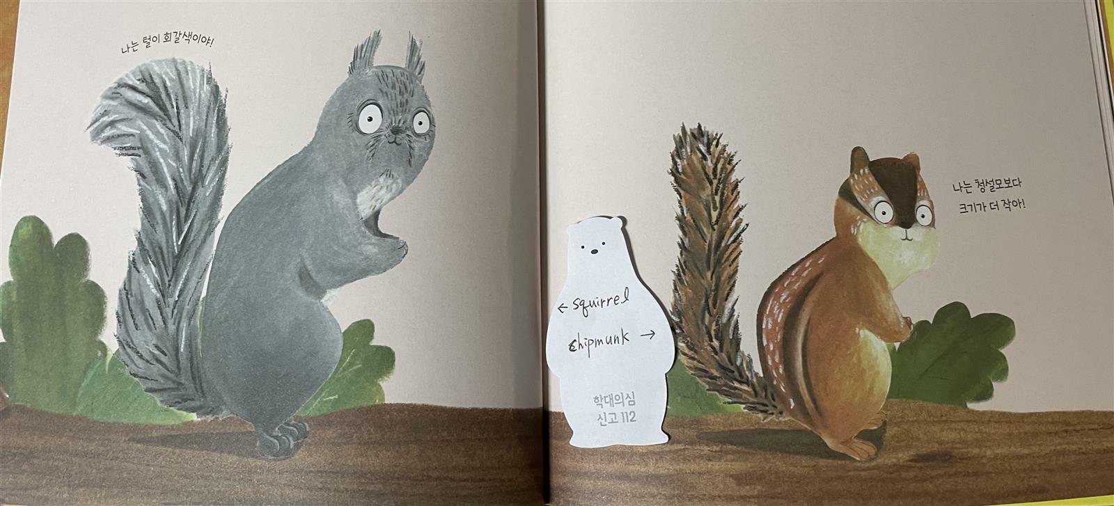 혹시 아이가 다람쥐랑 청설모를 헷갈려 하나요? ???♀?(저요) 아니면 라쿤과 너구리가 다른 동물임을 모르셨던 분 계시나요? ???♀?(저요) 밀밀 작가의 <아니야? 아니야!>를 보고 헷갈리는 동물들을 구분해 보는 시간을 가졌어요! 일단 청설모를 보여주며 아이에게 물어봤어요 “와~ 다람쥐같아! 어때? 다람쥐 맞아?” “응” ㅋㅋㅋㅋㅋㅋㅋ 저희 아이는 청설모와 다람쥐를 구분을 못합니다 “아니야! 나는 청설모야. 나는 털이 회갈색이야!” “내가 다람쥐야 등에 짙은 줄무늬가 있어. 나는 청설모보다 크기가 더 작아!” 그 다음에 '바다' 위에 동동 뜬 귀여운 동물 '수달'이 보이나요? 네 아니에요. 바다에는 수달이 없고 해달이 있습니다. 참고로 바다에 사는 해달은 미역줄기를 감고 잔다고 해요. (자다가 물에 떠밀려 가는 걸 막아준다고 합니다.) 그리고 수달과 달리 꼬리도 넓적한 특징도 있습니다. 그 다음 동물은 뭘까요~? 라쿤? 너구리? 저희 아이는 나무늘보라고…. ㅋㅋㅋㅋㅋㅋㅋㅋ (반전이었네요) 라쿤은 앞발이 사람 손과 비슷하게 생겨 손처럼 사용가능합니다 반면 너구리는 발다박 모양이 강아지와 비슷하다고 해요 그래서 라쿤 Vs 너구리 라쿤과 개과 라는 것도 처음 배우게 되었습니다: 추가 상식으론 너구리가 라쿤보다 엄청 더 크다고 해요. 그리고 부엉이와 올빼이의 차이를 아시나요? 올빼미는 머리가 동글동글합니다. 부엉이는 머리위이 귀 모양 깃이 있답니다. 그럼 영어로는 무엇일까요?! 저는 저 올빼미도 owl로 알려주었기에 영어단어 잘못 알려준건 아닌가 내심 걱정했는데 올빼미는 night owl 이라고하기하지만, 보통 올빼미나 부엉이를 모두 owl이라고 말한 한다고 합니다. 이 참에 아이와 영어로 동물명도 다시 배우고 가는 시간도 가졌어요 청설모는 squirrel 다람쥐는 chipmunk 해달은 sea otter 수달은 otter 라쿤은 raccoon 너구리는 raccoon dog 등등 그리고 문제! 재규어와 표범, 치타는 뭐가 다를까요? 밀밀 작가의 <아니야? 아니야!>에서도 구분하기 쉽게 알려주었어요. 머리에 쏙쏙! 큰 포인트를 알려주니 이제는 동물원에 가서도 헷갈리지 않고 아이에게 잘 말 해줄 수 있을거 같아요. 게다가 아이도 알쏭달쏭 비슷하지만 서로 동물들을 알아보면서 관찰력도 키우고, 지식도 한컷 배우는 독서시간을 가졌네요. 몇회독 하다보니, 저희 아이는 표범하고 재규어는 아직 헷갈려하지만, 치타는 이제 구분합니다?? 동물을 좋아하지만 아직 헷갈려하는 아이들에게 읽어주면 좋은 밀밀 작가의 <아니야? 아니야!>로 즐거운 책육아시간 가져보세요! [출판사로부터 도서 협찬을 받았고 본인의 주관적인 견해에 의하여 작성함]