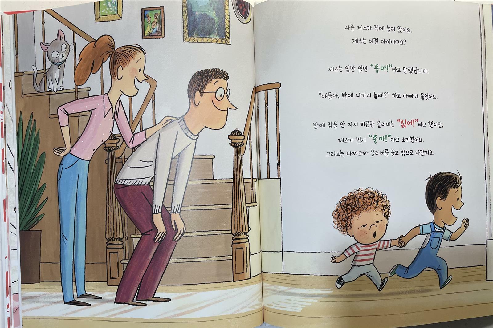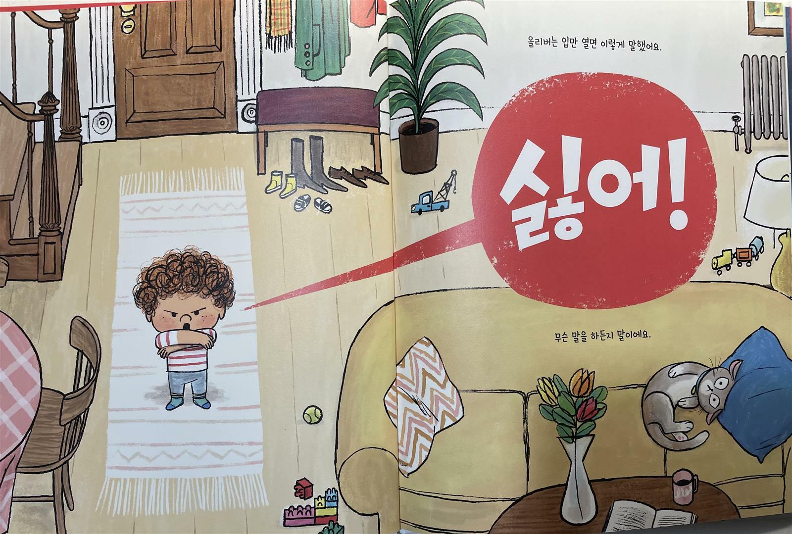 양치하자~ 싫어! 샤워하자~ 싫어! 어휴.... 노는 건 그렇게 좋아하면서 생활에 꼭 필수적인 건 “싫어싫어!!!”하는 시기가 왔어요. “싫어!”라고 말하는 것은 이제 슬슬 부모로부터 독립적으로 행동하기 위한 것이라고 들었지만..... 글쎄요... 위 사례 외엔 꼭 엄마를 찾는 엄마쟁이인 아이를 보면 그건 아닌거 같다는 생각이 듭니다... 암튼 그런 아이에게 읽어주면 좋을 거 같은 책이 있어요. 크리스 그라벤스타인의 <싫어는 아주아주 힘이 세!>입니다. 올리버는 입만 열면 이렇게 말했어요. “싫어!” 무슨 말을 하든지 말이에요. 이 닦을래? 싫어! 밥 먹을래? 싫어! 장난감 좀 치울래? 셇어! 그네에 똑바로 앉아야지? 싫어어어어어어.... 올리버의 ‘싫어!’는 점점 커지고 힘이 세졌어요. 아무도 못 말리는 고집쟁이가 되었지요. 심지어 올리버는 아이스크림도 싫다고 했어요. “싫어요!” 퍼즐도, 물감도, 피자도, 푸딩도, 무엇이든 다 싫다고만 했지요. 얼마 후, 올리버의 ‘싫어!’는 아주아주 힘이 세져서 천하무적이 되었어요. 그런데 어느 날 아침, 사촌 제스가 집에 놀러 왔어요. 제스는 입만 열면 “좋아!”라고 말했답니다. 그런 제스는 올리버를 끌고 밖으로 나갔어요. 그리고 올리버는 제스와 함께 이것저것 여러 가지를 했지요. 올리버의 아주아주 힘센 “싫어!“ Vs 제스의 무지무지 힘센 ”좋아!“ 과연 누가 이길까요? ---------------------------------------- 사실 이 책을 읽는다고 바로 “좋다.”고 말하는 아이는 없을 거에요. 다만 ”좋아!”라는 표현도 했음 좋겠다를 말해주는 시간을 가졌습니다. 아이들에게 긍정적인 말의 힘을 알려 주고 언어 습관을 바로잡는 데 도움을 주는데 도움을 주길 바랍니다. 제발 “싫어!”대신 “좋아!”라고 해줘~~~🙏 [출판사로부터 도서 협찬을 받았고 본인의 주관적인 견해에 의하여 작성함]