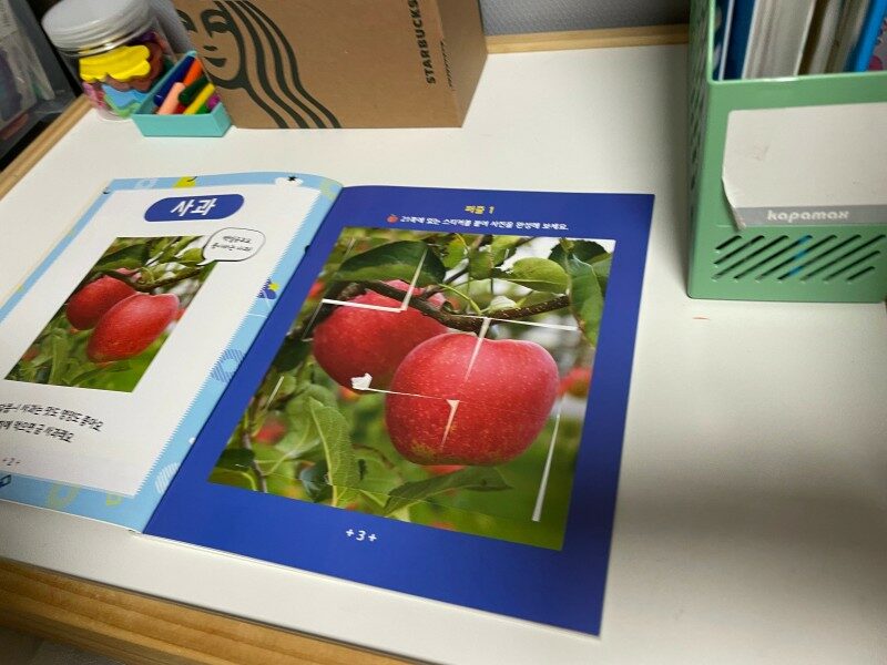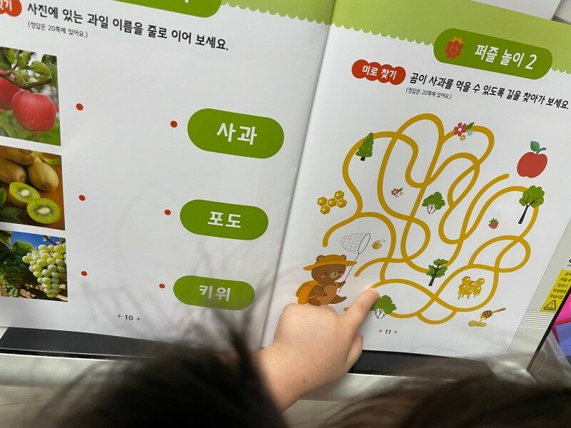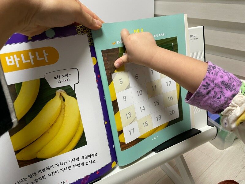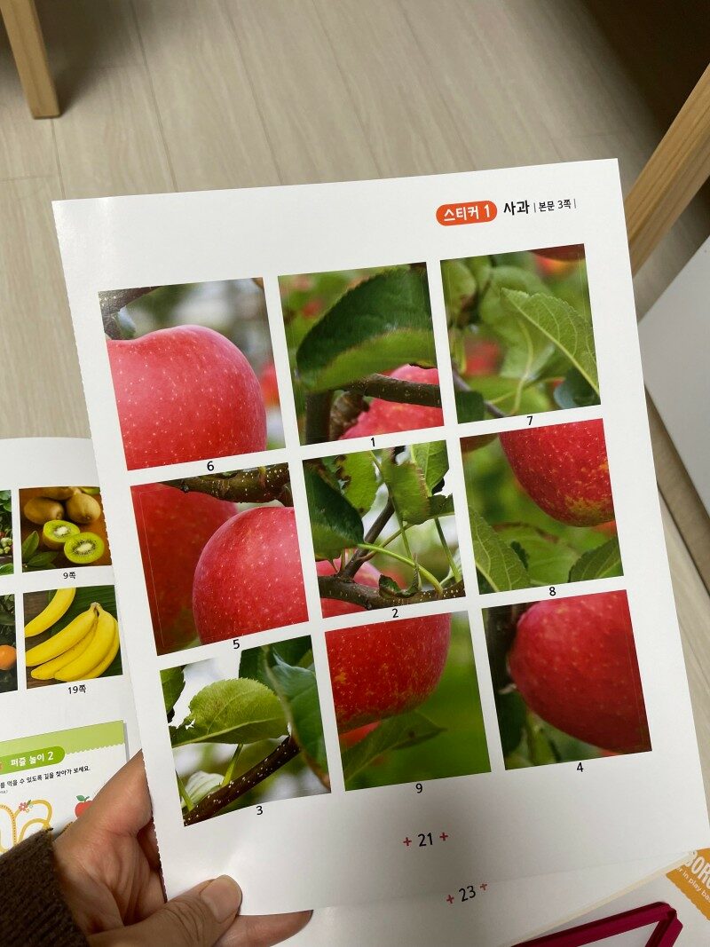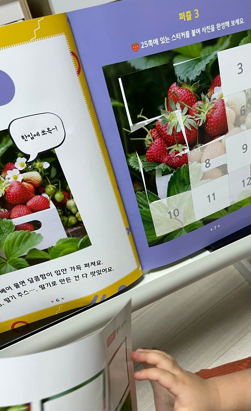 저희 아이가 슬슬 퍼즐에 관심이 생기고 있어요~ 작년만해도 조금 하다가 재미없다고 싫증내었지민 지금은 10피스이상도 하더라구요~ (주의, 관심있는 캐릭터이면 합니다 ㅎㅎ) 그러다가 흥미로운 퍼즐을 접하게 되었어요. 바로 <조각조각 스티커 퍼즐북 ③ 과일/채소>입니다. 많은 스티커 놀이북은 봤지만 “스티커 퍼즐”북이 있는건 처음 알았어요~ 스티커 8쪽을 포함해 36쪽으로 양은 많지는 않아요. 그래서 아이가 부담없어할 수 있어요. (아직 책이 두꺼우면? 도망갈 나이 아닌가요?! ㅎㅎㅎ) 사과 키위 딸기 당근 바나나 등의 사진 속 과일/채소를 인지한 뒤, 섞여 있는 스티커를 숫자대로 맞추면 사진 퍼즐은 완성됩니다! 처음에는 9조각의 쉬운 퍼즐로 시작해요 그러다 점점 12조각, 그리고 20조각의 사진 퍼즐이 있습니다. 막 숫자를 배우기 시작한 아이나 숫자에 관심이 있는 아이에게 숫자 읽기/매치 연습을 하기에도 좋을거 같아요. 과일/채소 사진만 단순히 있는게 아니라 대상의 기본 정보도 간단히 적혀있어요. 예를 들어 키위는 “이름만 들어도 시고 침이 고이는 키위! 키위를 먹으면 똥도 잘 누고 감기도 예방해 줘요.” 포도는 “동글동글 포도 송이가 나무에서 주렁주렁. 보라색 포도, 길쭉한 포도 등 여러 포도가 있어요.” 라고 적혀 있습니다. 사과를 바로 척척 붙이는 아이! 몇분도 안 걸려요!!!??? 아이의 성취감을 심어주기 아주 좋네요~ 아이가 탄력받아서 포도, 딸기, 바나나 등의 과일을 골라서 하는데 스티커를 직접 떼어내고 숫자에 맞춰 붙이는 과정에서 소근육 발달을 돕고, 눈과 손의 협응력(신경 기관과 근육이 서로 호응하며 조화롭게 움직일 수 있는 능력)을 키울 수있는 시간이 된거 같아요. 그리고 퍼즐북에는 퍼즐만 있는게 아니거 과일 이름 찾기와 미로 찾기도 하는 코너가 한 장 있습니다. 아쉬운 점은 일회성이라는 거에요.. 엄가다를 해서 스티커를 코팅해 벨크로를 붙이면 계속 사용가능한 다회성 퍼즐북이 될지도 모르겠네 싶습니다 아이가 재밌어해서 다른 조각조각 스티커 퍼즐북 ①동물과 ②곤충 버전도 구매해 보려고 해요~ 아이의 성취감도 자신감을 키워주는 퍼즐북! 오늘도 즐거운 책육아했습니다~ [출판사로부터 도서 협찬을 받았고 본인의 주관적인 견해에 의하여 작성함]
