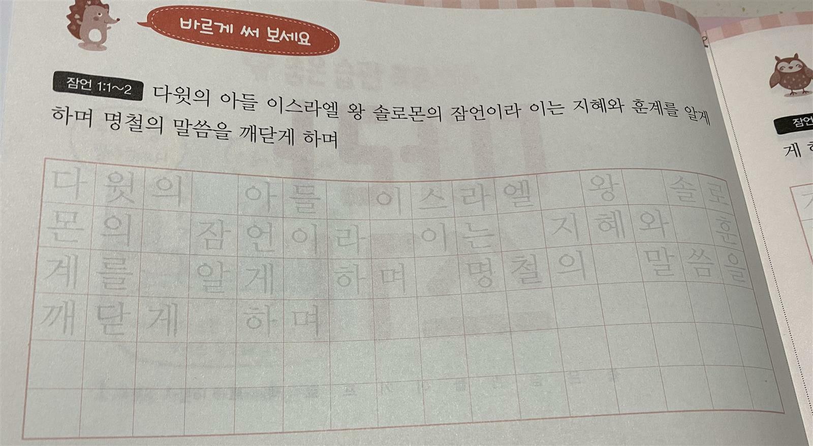 혹은 이제 슬슬 글씨 연습을 많이 해야 할 아이라면, 아이와 하루에 한장씩 써보고 소리내어 읽어보는 것도 좋을 거 같네요! 네모 칸에 맞추어 한 글자 한 글자씩 써나가다 보면 집중력과 인내심을 높이는 데 큰 도움이 될거 같아요.