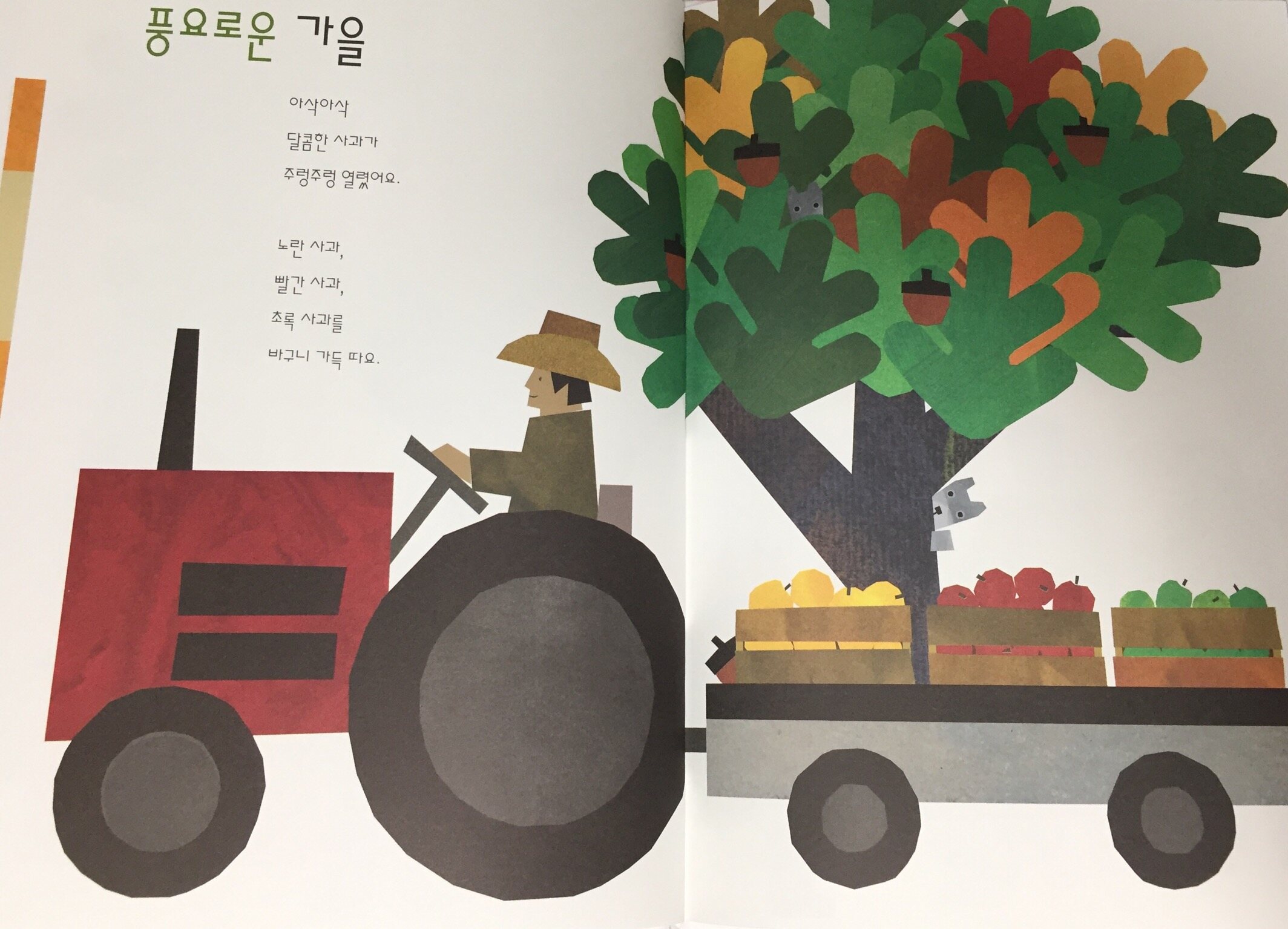 가을 관련 유아 도서중엔 낙엽, 도토리 관련책은 흔히 봤는데, 사과 옥수수 호박 등의 수확도 그려진 책이라 더 매력적인거 같아요.