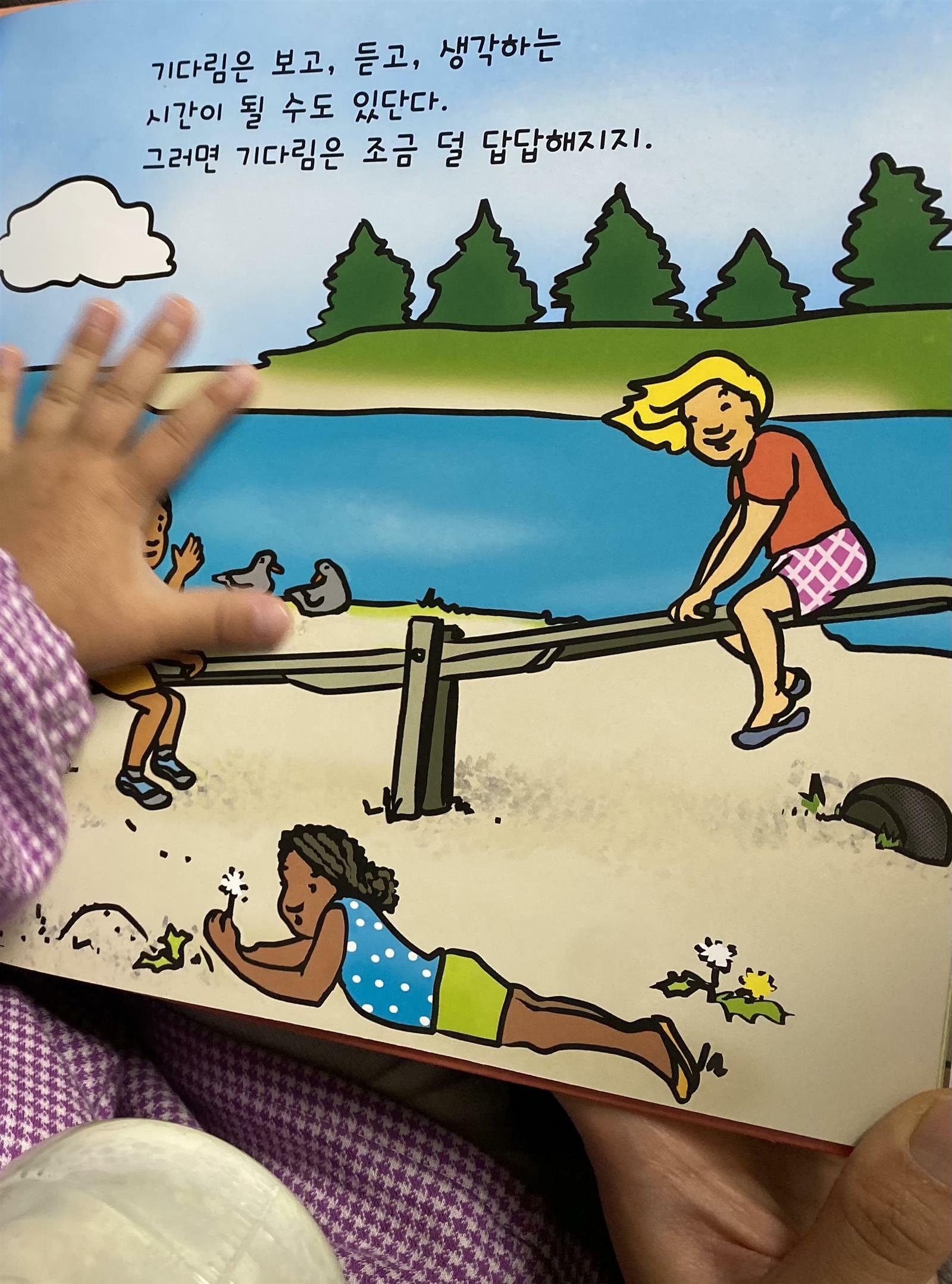 어느 상황에서든 기다림이 결코 나쁘지 않다는 걸 알려주고 싶어서 엘리자베스 버딕 글, 마리카 하인렌 그림의 <기다림 기다림 기다림>을 읽어줬어요.