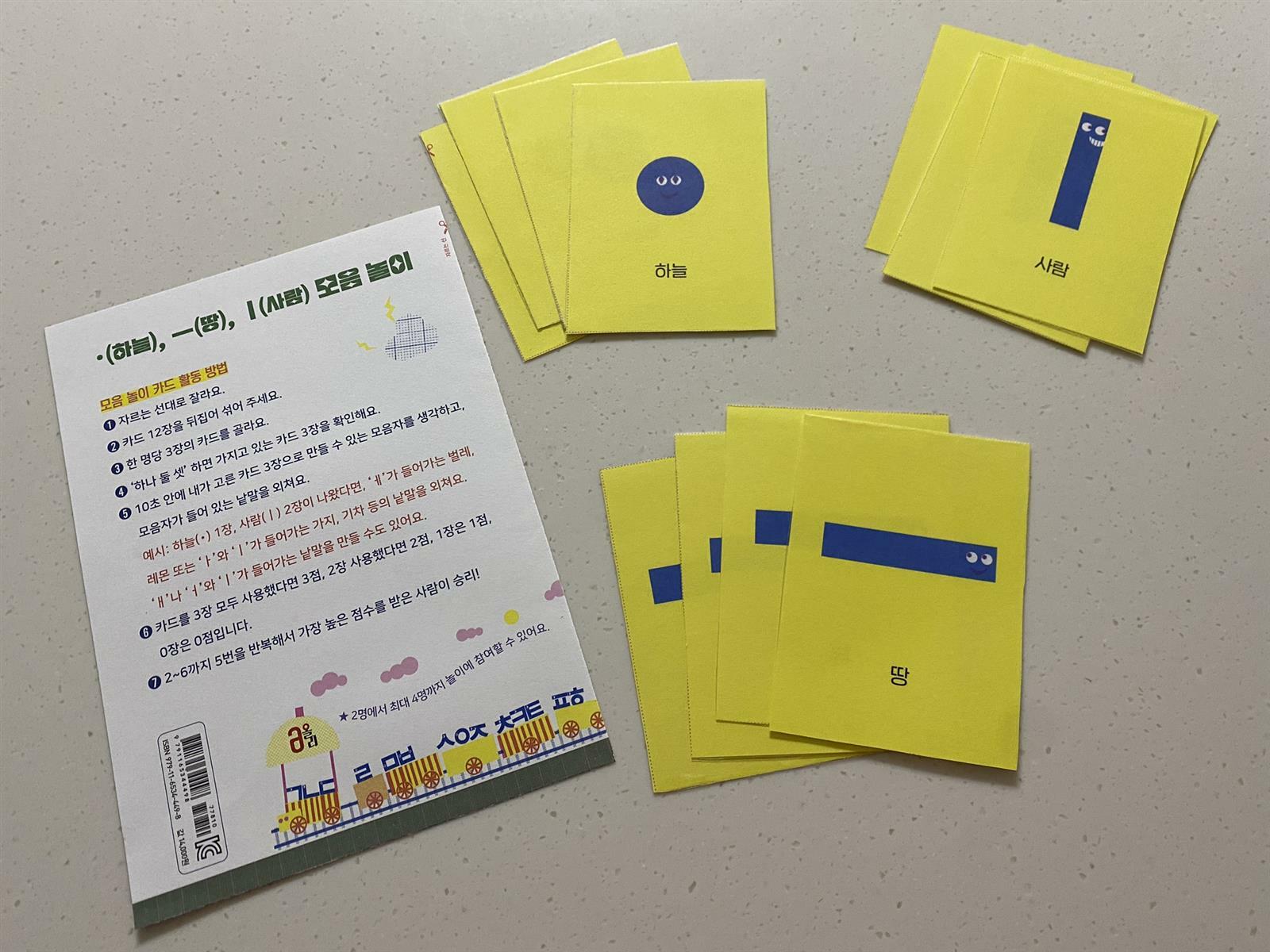 모음 놀이를 할 수 있는 하늘(•), 땅(ㅡ), 사람(l) 카드가 함께 수록되어 있어요.