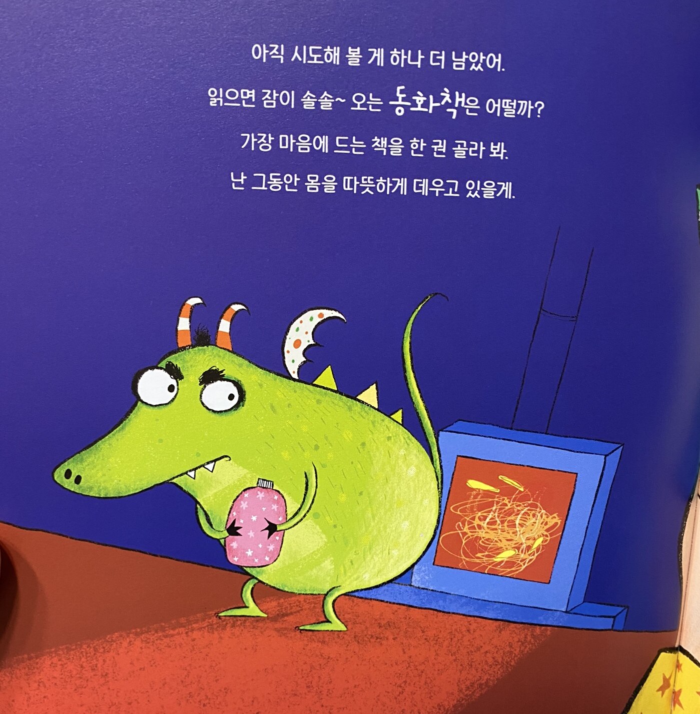 귀여운 용이 잠이 오지 않는 아이에게 자신이 재워준다고 하면서 막상 용이 먼저 잠드는(?!) 유쾌한 동화책입니다.(웃음) 잠드는 과정은 즐거운 과정임을 가르쳐 주는 책이구나 싶더군요.
