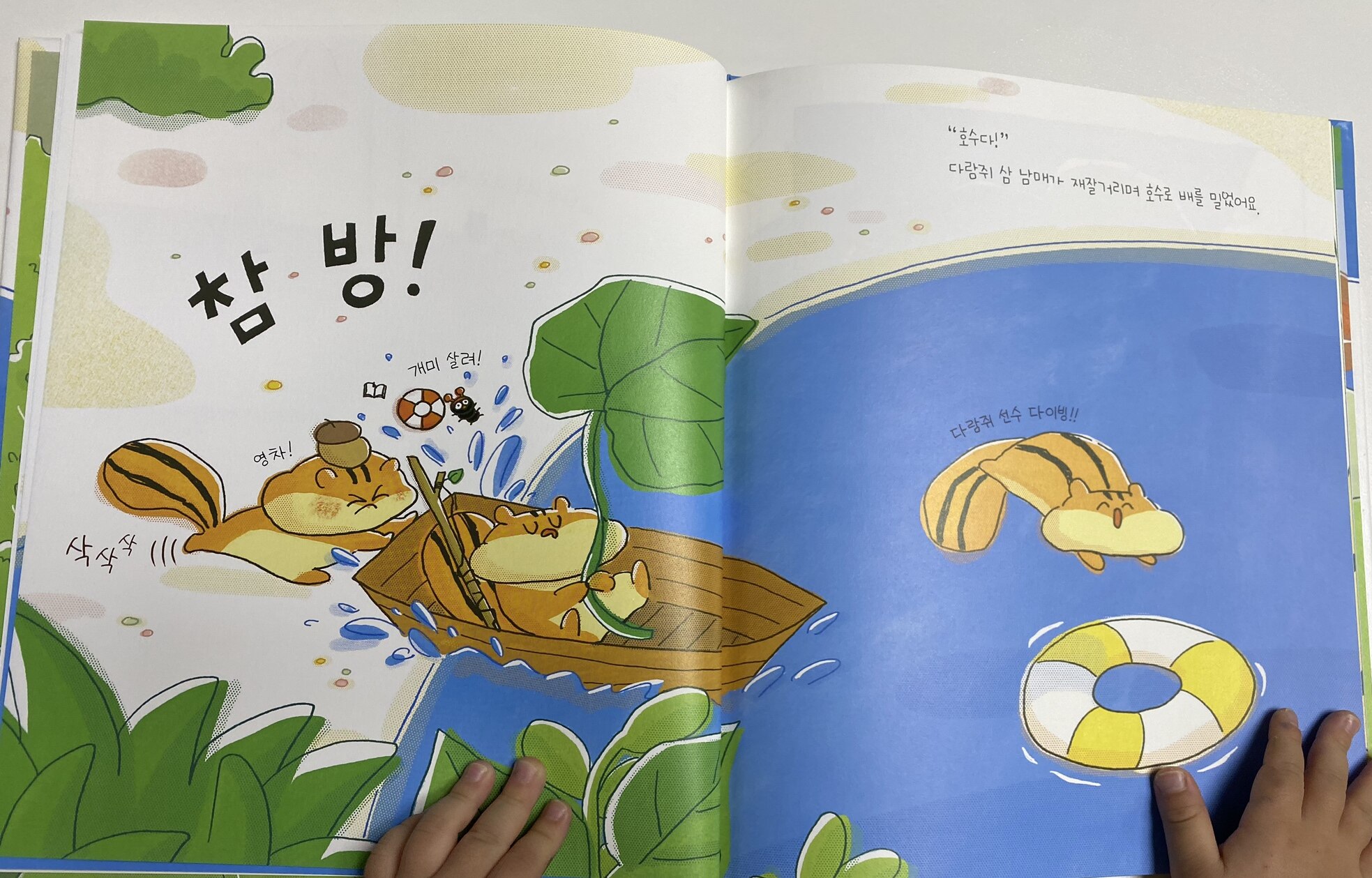 "우아, 호수다"라며 다람쥐 삼남매가 뛰어 들어요.