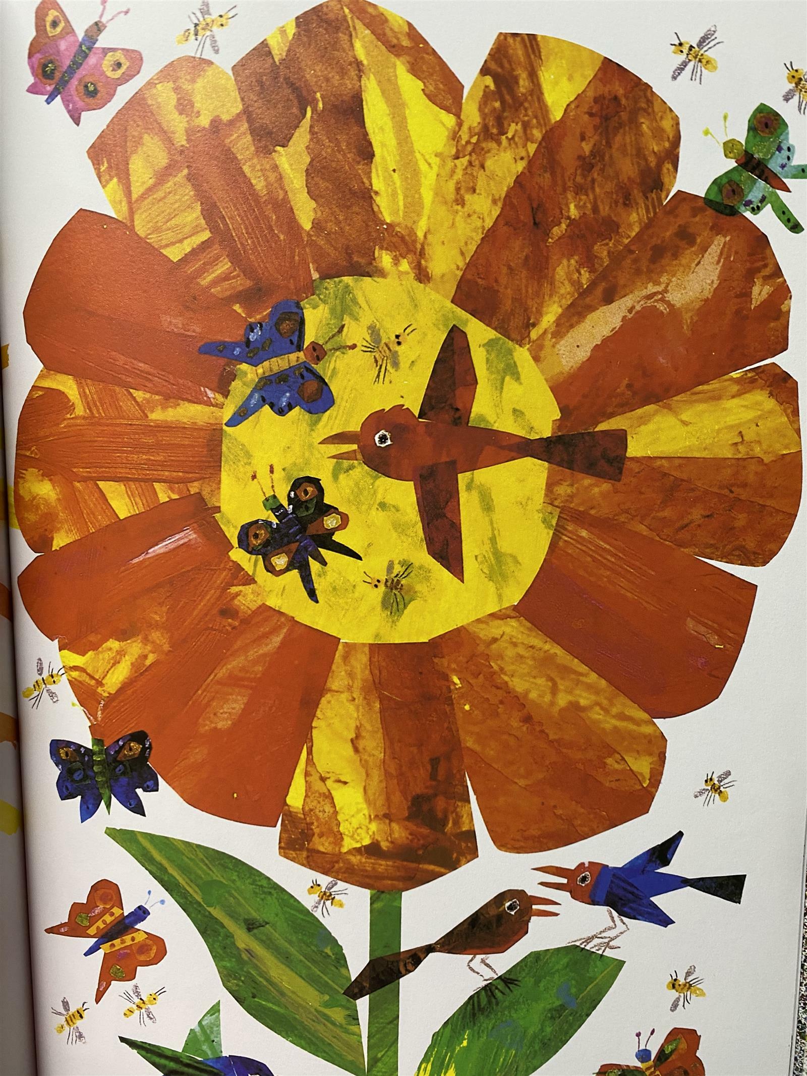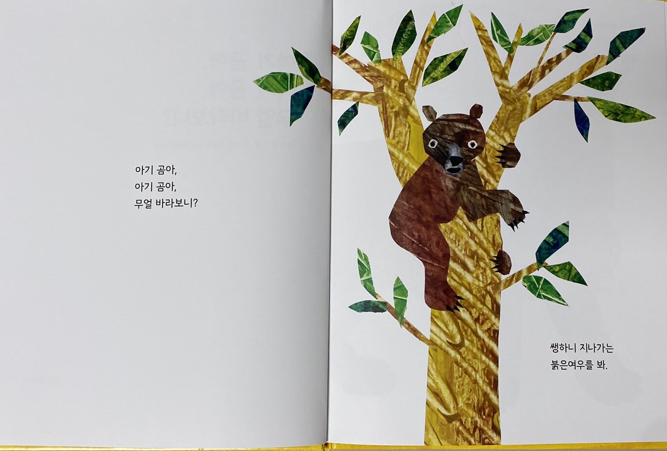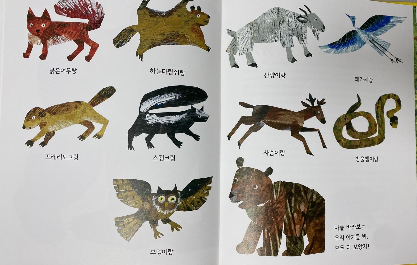 에릭 칼은 야생 동물들을 멋지게 소개하기 위해 전작 <갈색 곰아, 갈색 곰아, 무얼 바라보니?>보다 더 화려하고 선명한 콜라주 작업을 했어요.