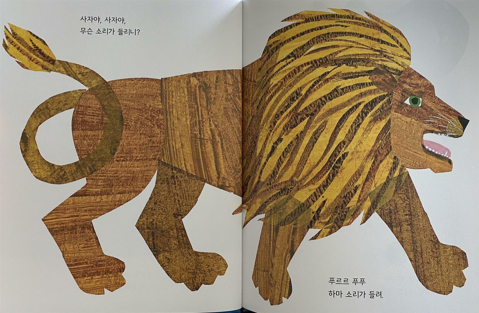 그러자 북극곰은 “으르렁 크앙, 사자 소리가 들려.”라고 대답합니다.