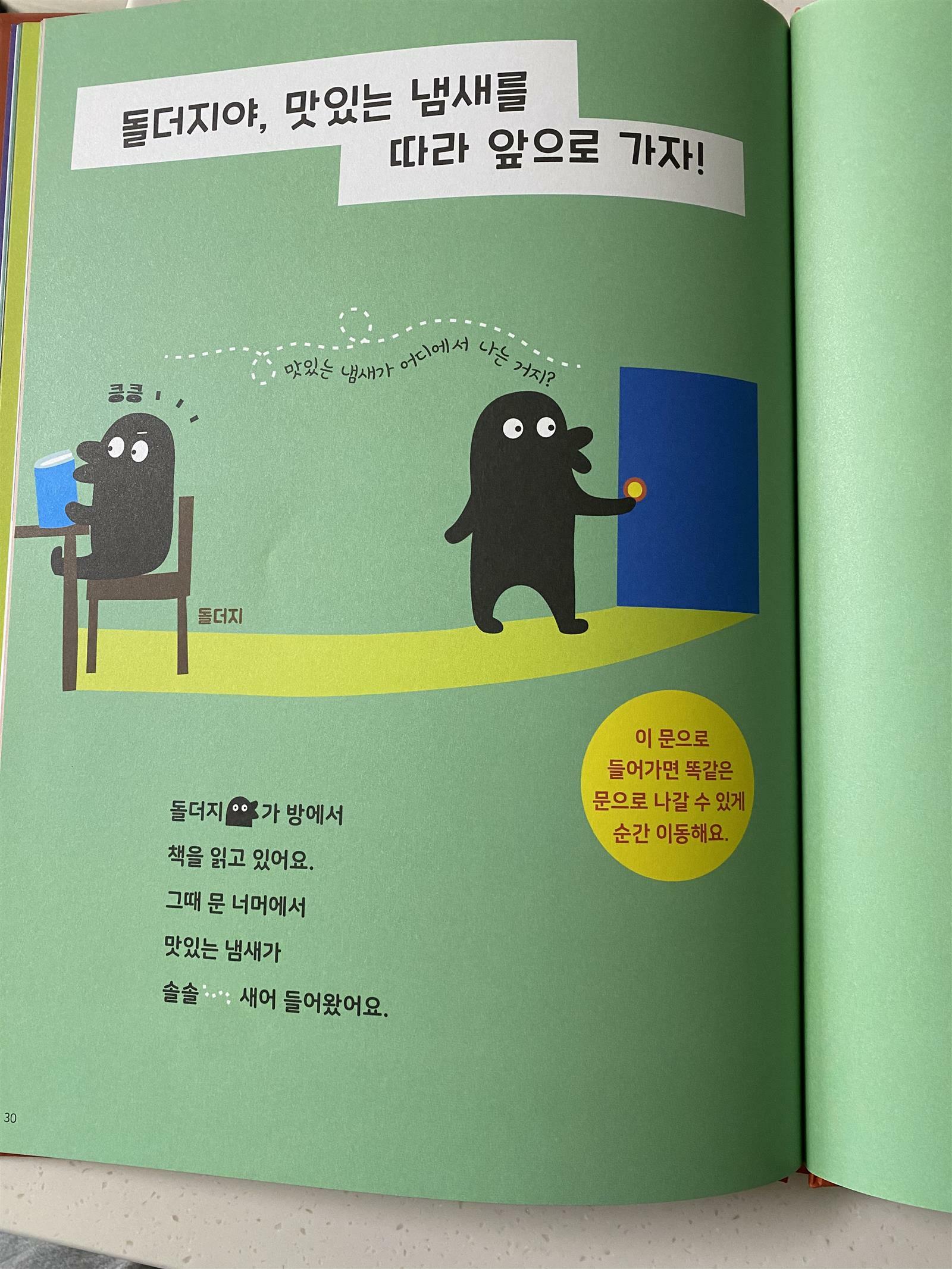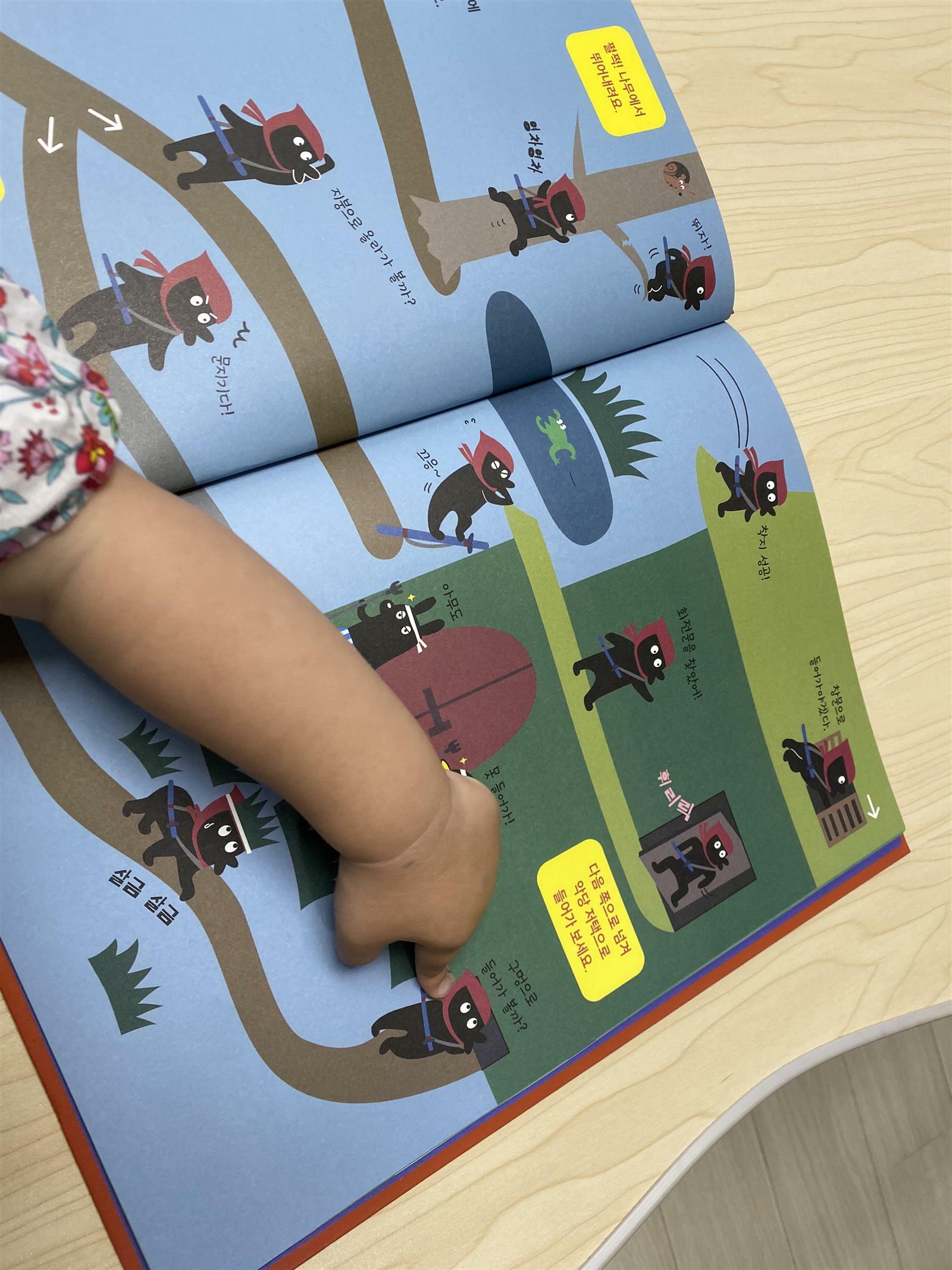 아기가 천장에서 흔들거리는 인형을 향해 인사하듯 고사리손을 뻗는 그림부터 이야기가 시작이 됩니다.