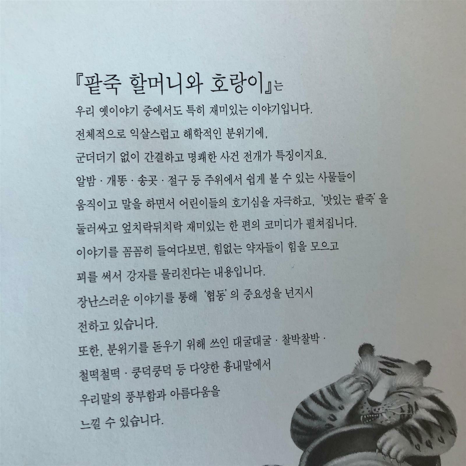 이렇게나 교훈적인 이야기라니!!!!!주위 물건들이 힘을합쳐 할머니를 도와줍니다.팥죽을 한그릇씩 얻어먹고요!!세상에 공짜는 없어요 ㅎ 배를 든든히 해줘야 말을 잘 듣는것 같아요 ㅋ팥이 다 자라서 가을에 팥죽을 쑬 때 오겠다고 약속한 호랑이는 약속을 잘 지켰는데 할머니도 못 잡아먹고 한강에 빠지고 맙니다.호랑이야 다른데 가서 잘 살아라!!!