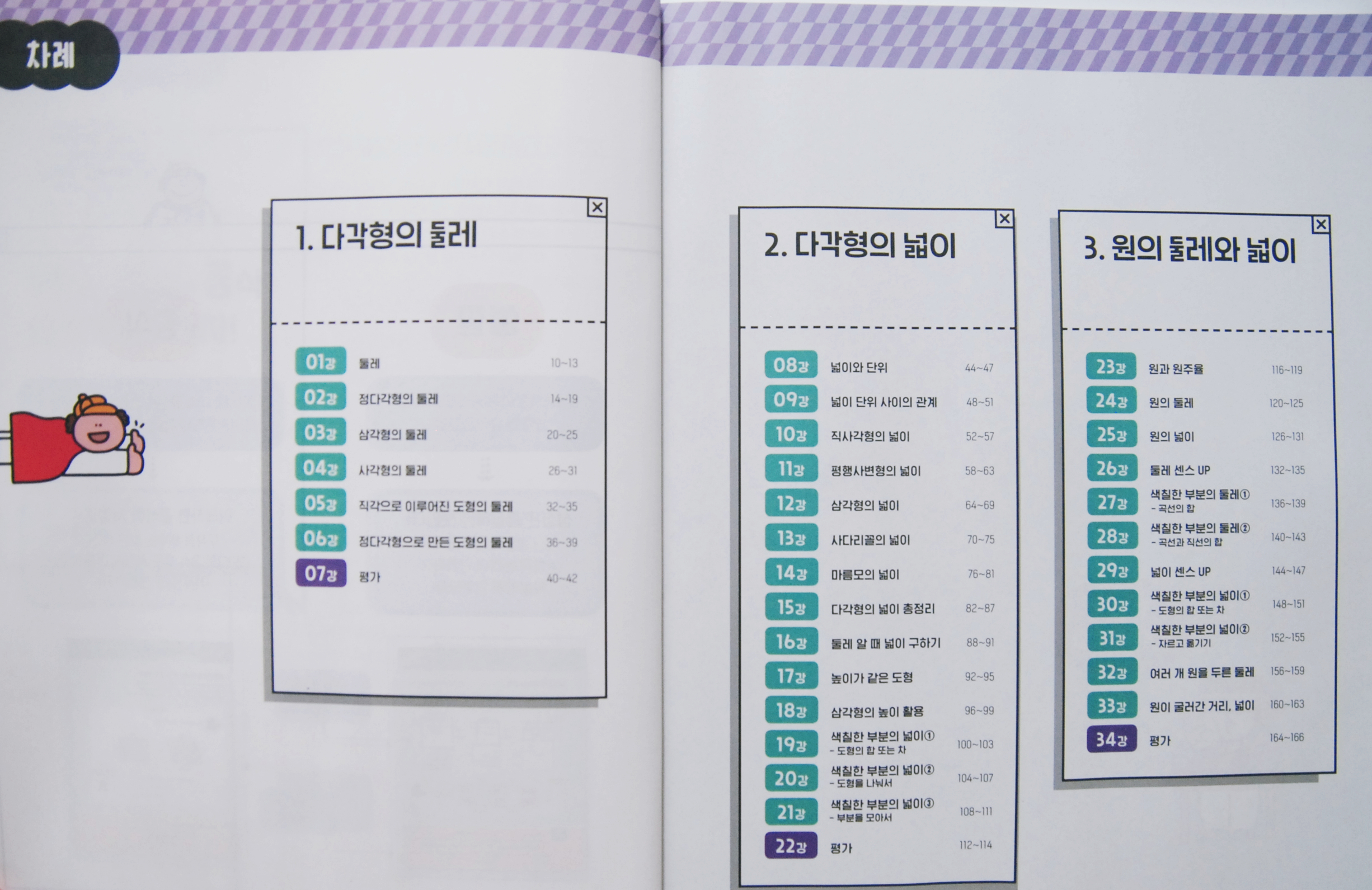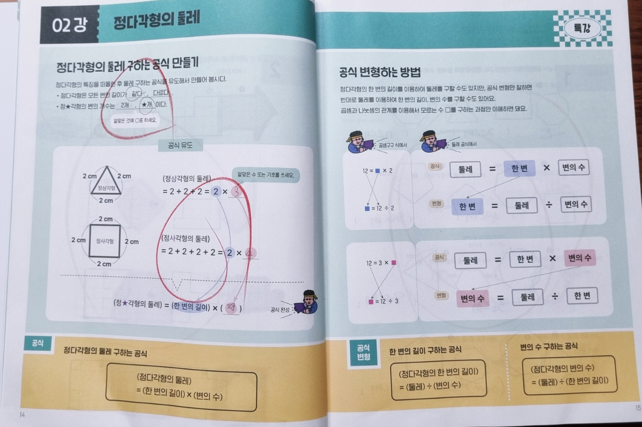 아이의 학년이 올라갈수록 수학에서도 유독 어려워하는 부분이나 취약한 부분들이 생겨나게 되더라고요. 특히 아직까지 학원을 다니지 않고 엄마가 집에서 봐주고 있다 보니 그런 부분에 대한 걱정이 좀 큰 편이랍니다. 그래서 가능하면 아이가 어려워하거나 취약한 부분은 그 부분만 따로 되어 있는 문제집을 사서 풀리려고 하는 편인데요, 생각보다 쉬운 것 같으면서 은근히 헷갈리고 어려운 초등 도형, 평면도형에 대해서 아이와 따로 공부해 보기로 했어요.공식이 쏙 외워지는 평면도형에 나오는 내용을 살펴보았더니 다각형의 둘레와 넓이, 그리고 원의 둘레와 넓이의 내용을 다루고 있었어요. 우리 아이는 현재 초등학교 5학년이라서 지금 분수의 덧셈과 뺄셈을 학교에서 배우고 있는 중이고, 마침 그다음 단원이 다각형의 둘레와 넓이라 정말 알맞은 선택이라는 생각을 했어요.현재 아이와 함께 6단 원인 다각형의 둘레와 넓이를 미리 살펴보고 있는데 생각보다 아이가 너무 헷갈려 하는 거예요 ㅠ 물론 아직 배우지 않아서 어려울 순 있어도 개념 부분을 읽어보면서 이해가 어려운듯한 느낌? 아무래도 기존 문제집은 짧은 개념 설명에 문제로 나와 있어서 아이가 헷갈려 하거나 이해가 안 되는 부분을 쉽게 알기가 어렵더라고요. 그래서 공식이 쏙 외워지는 기적특강 평면도형은 지금 우리 아이가 진행하고 있는 단원에 정말 알맞아서 좋았어요. 조금 미리 살펴본다면 더할 나위 없이 좋겠지만 아직 늦지 않았기에 열심히 해보려고 합니다. 도형이나 측정 영역은 아이들이 쉽다고 느끼기도 하지만 생각보다 수, 연산보다 어려워하는 아이들이 많더라고요. 개인적으로 아이가 공식을 줄줄 외우거나 외운 공식을 대입해서 문제를 푸는 것이 아니라 왜 그렇게 되었는지에 대한 의문을 가지고 또한 개념을 좀 제대로 잡길 바랐어요. 그래서 다짜고짜 무작정 외우기보다는 논리적으로 생각하면서 도형을 공부할 수 있는 방법이 없을까 고민했던 것 같아요. 먼저 기적쌤 특강으로 아이가 원리를 이해하고, 배운 것을 혼자 적용하고 복습해서 내 것으로 소화하는 것이 우선이랍니다. 특별 강의 자체가 아이들이 보기 쉽게 설명이 되어 있어서 이해가 잘 되겠더라고요. 거기에 복습 문제를 풀면서 실력을 키울 수 있어요!한눈에 쏙 보이는 설명과 함께 약속, 성질, 공식을 배우고 기억할 수 있어요. 우리가 수학 용어나 기호 등 그 의미를 정해놓은 것이 약속이라고 합니다. 약속은 이미 정해진 것이라 그림 덩어리로 기억을 하고, 정확한 수학 언어로 무조건 암기하기!! 그럼 성질은? 성질도 암기를 해야 할까요? 성질은 관찰하면 보이는 부분이랍니다. 당연해 보이지만 수학적 논리에 근거해서 확실히 기억하는 게 좋아요. 그리고 공식 등장! 무작정 외우는 것은 이제 그만! 약속과 성질을 바탕으로 증명된 사실을 문자나 기호로 나타내고 있는 것이기 때문에 증명으로 공식 유도 과정을 이해하고 자유자재로 변형할 수 있어야 한다는 사실! 어려운 문제나 풀이 과정이 복잡한 문제여도 기적쌤의 설명에 따라 문제 해결방법을 배우면서 공식 적용력과 활용력을 높일 수 있답니다. 그리고 단원에서 공부한 내용을 평가로 마무리하면서 부족한 부분이 없는지 체크하면 완벽하죠?사실 타 문제집에서 다각형의 둘레와 넓이를 푸는데 유독 이해를 못 하고 어려워하는 모습을 보여서 걱정을 많이 했어요. 그런데 생각보다 잘 이해하고 문제를 풀어나가는 걸 볼 수 있었어요.우리 아이는 단계에 맞춰 진도를 나갔지만 도형은 초등학교 3학년부터 나오기 때문에 미리미리 준비할 수 있다면 더욱 좋겠다는 생각이 들더라고요. 그래서 우리 둘째는 조금 빨리 도형을 챙겨야겠다고 생각했어요. 아이가 무조건 외우는 것이 아니라 타당한 근거를 들어서 사고를 확장하며 논리적으로 공부할 수 있도록 도움을 줘야겠어요. 아이의 약점을 강점으로 만들어주는 길벗스쿨 기적특강! 볼수록 매력적인 것 같아요 ㅎ