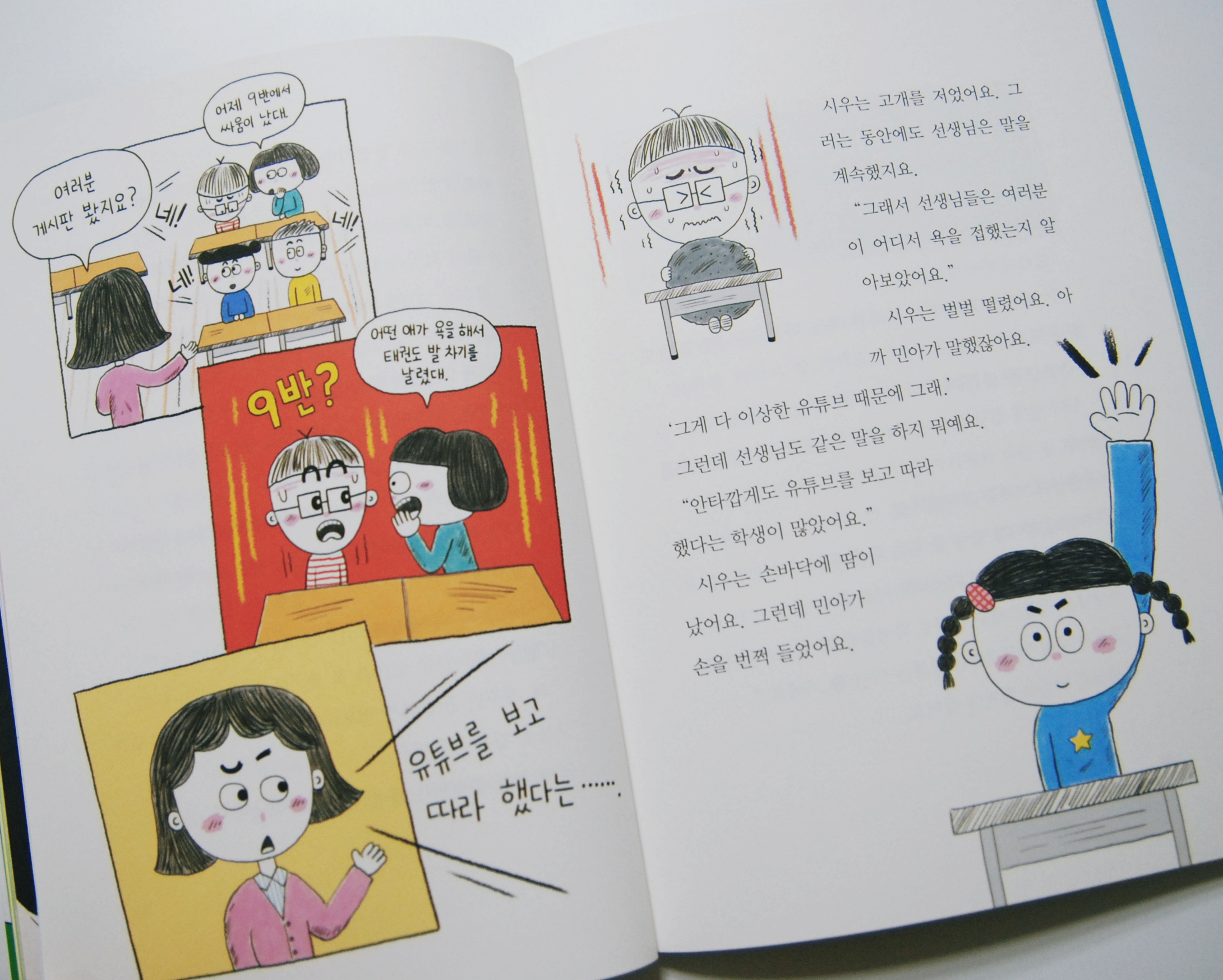 요즘 아이들은 우리와 달리 어릴 때부터 스마트폰, 탭 등 미디어 매체들을 일찍 접하는 편입니다. 저 역시 아이들에게 스마트폰을 일찍 사주지 않으려고 노력했지만 일을 하고 있어서 그게 쉽지 않더라고요. 대신 게임이나 인터넷은 일체 안 되도록 차단을 해두고 전화나 문자만 사용을 하고 있어서 무분별한 사용이 되고 있진 않지만 주변 친구들을 보면 정말 쉽게 게임도 하고, 유튜브로 영상도 보는 일이 많더라고요. 초등학교 5학년인 첫째는 거의 모든 친구들이 유튜브를 보고 있어서 우리 아이에게도 재미있는 링크를 보내주는 일이 종종 있었어요. 아예 열 수 없으니 의미는 없지만 그럴 때마다 인터넷이나 유튜브를 해줘야 하나? 생각이 들다가도 어른도 쉽게 끊어내기 힘들고 자극적인 영상들이 무분별하게 나오는 걸 보니 아직은 아니야라는 생각이 강하게 드는 건 어쩔 수가 없어요. 이번 이야기는 유튜브에 빠지게 된 시우의 이야기랍니다. 어떤 일들이 벌어지는지 궁금하지 않나요? 얼른 만나볼게요~주인공인 시우는 게임과 유튜브를 좋아하는 2학년 2반 친구랍니다. 우리 둘째도 지금 2학년 2반이라서 시우에게 많은 관심을 보이더라고요 ㅋ 같은 나이에 같은 반까지! 게임도, 유튜브도 좋아하니 공통점이 참 많죠? 주인공인 시우와 친구 동원이가 사이좋게 지내는 장면들이 참 보기 좋았어요. 1학년에는 같은 반이었지만 2학년에 반이 달라서 자주 보지는 못하지만 일주일에 한 번 둘이 만나서 같이 노는데 둘의 우정에 엄마 미소가 절로 지어진답니다. 둘이 어찌나 서로를 위하고 사이가 좋은지.. 그러던 어느 날 시우가 다니는 피아노 학원에 새 친구가 오게 된답니다. 이름은 유강민. 별명이 유튜브 박사래요~ 첫날부터 재미있고 활발한 강민이가 마음에 든 시우. 강민이는 시우에게 '내 맘대로 유튜브'를 알려주면서 시우가 깨지 못했던 게임도 깰 수 있게 도와주고, 재미있는 영상들을 마구 소개해 준답니다. 욕이 섞여 나오기도 하고, 강민이가 그 욕을 따라 쓰고 있어서 불편하기도 했지만 계속 영상을 보는 시우.이제 시우 앞에는 새로운 세상이 열렸어요. 이 채널은 재미있고 신기한 영상들이 가득했어요. 다만 영상에 푹 빠진 시우는 자신도 모르게 강민이의 말투를 따라 하고 있다는 사실도 알아차리지 못했답니다. 그러면서 그날 이후로 시우가 달라지기 시작합니다. 친구들에게도 그 유튜브를 알려 주고, 잠도 안 자고 그 유튜브만 보면서 자기도 모르게 나쁜 말을 하고 있었어요.그런데 학교에서 많은 친구들이 욕을 하게 되는 일이 벌어지자 다양한 일들이 일어나게 된답니다. 친구들끼리 욕을 하기도 하고, 욕을 들은 친구는 태권도 발차기를 하기도 하고.. 거기다 시우는 이런 일이 모두 자기 탓인 것 같고 자기의 잘못이 탄로 날까 봐 전전긍긍하게 된답니다. 결국 단짝 동원이와도 멀어지게 되고, 친하게 지내던 강민이도 피아노 학원을 그만두게 되고.. 모두 유튜브 때문인 것 같은 시우. 이제 시우는 다시 예전처럼 친구들과 친해질 수 있을까요? 아이와 책을 통해 확인해 보세요 ^^재미있고 안전한 유튜브 시청을 위한 주제로 모둠별로 과제를 하게 되었는데 시우가 속한 조는 나쁜 영상을 보는 친구들을 위해 연극을 하기로 결정했어요. 개인적으로 아이들의 연극이 참 참신하고 재미있더라고요. 저렇게 연극을 만들어보고 직접 역할을 맡아서 해보면서 깨달을 수 있어서 아이들에게 참 좋은 방법이 되는 것 같아요.우리 집은 유튜브를 허용하는 편은 아니지만 아이가 종이접기나 궁금한 부분을 찾을 때 한 번씩 허용을 하고 있어요. 그런데 무분별한 광고나 연계되어 나오는 영상들이 썩 도움이 된다는 생각이 들지가 않아요. 항상 제가 있을 때 유튜브 사용을 하기 때문에 그런 부분은 제가 체크를 하고 있지만 주변 친구들 이야기를 들어보니 하루 종일 유튜브를 본다거나 잠도 안 자고 폰만 붙잡고 있는 경우가 많아 부모와의 갈등도 많은 편이더라고요. 저 역시 유튜브를 잡으면 시간 가는 줄 모르고 빠져서 보게 되고 도움이 되는 영상도 많지만 실상은 조회수를 높이기 위해 자극적이거나 폭력적 내용도 담겨 있는 경우가 많더라고요. 아이들이 무방비하게 그런 영상들에 노출이 되다 보니 보면서 늘 걱정이 되기도 합니다. 한 번은 아이가 나쁜 말을 자주 쓰길래 그게 무슨 뜻이냐고 물어봤더니 모르더라고요. 어디서 들었냐고 하니 친구들이 잘 쓰는 말이라고 합니다. 뜻도 모르고 따라 쓰는 그 말이 나쁜 말이라고 알려주고 우리 아이가 유튜브에 노출되지 않아도 친구들에 의해서도 영향을 받을 수 있구나라는 생각을 했던 것 같아요. 이번 내 맘대로 유튜브 책을 통해서 아이가 그때 일이 생각나서 저에게 말을 하더라고요. 책을 읽으면서 생각하고 고민하는 아이를 보니 유익한 시간이 되었던 것 같아요. 앞으로 안전하고 즐겁게 유튜브를 즐길 수 있도록 많은 관심과 도움을 주도록 해야겠어요 ^^