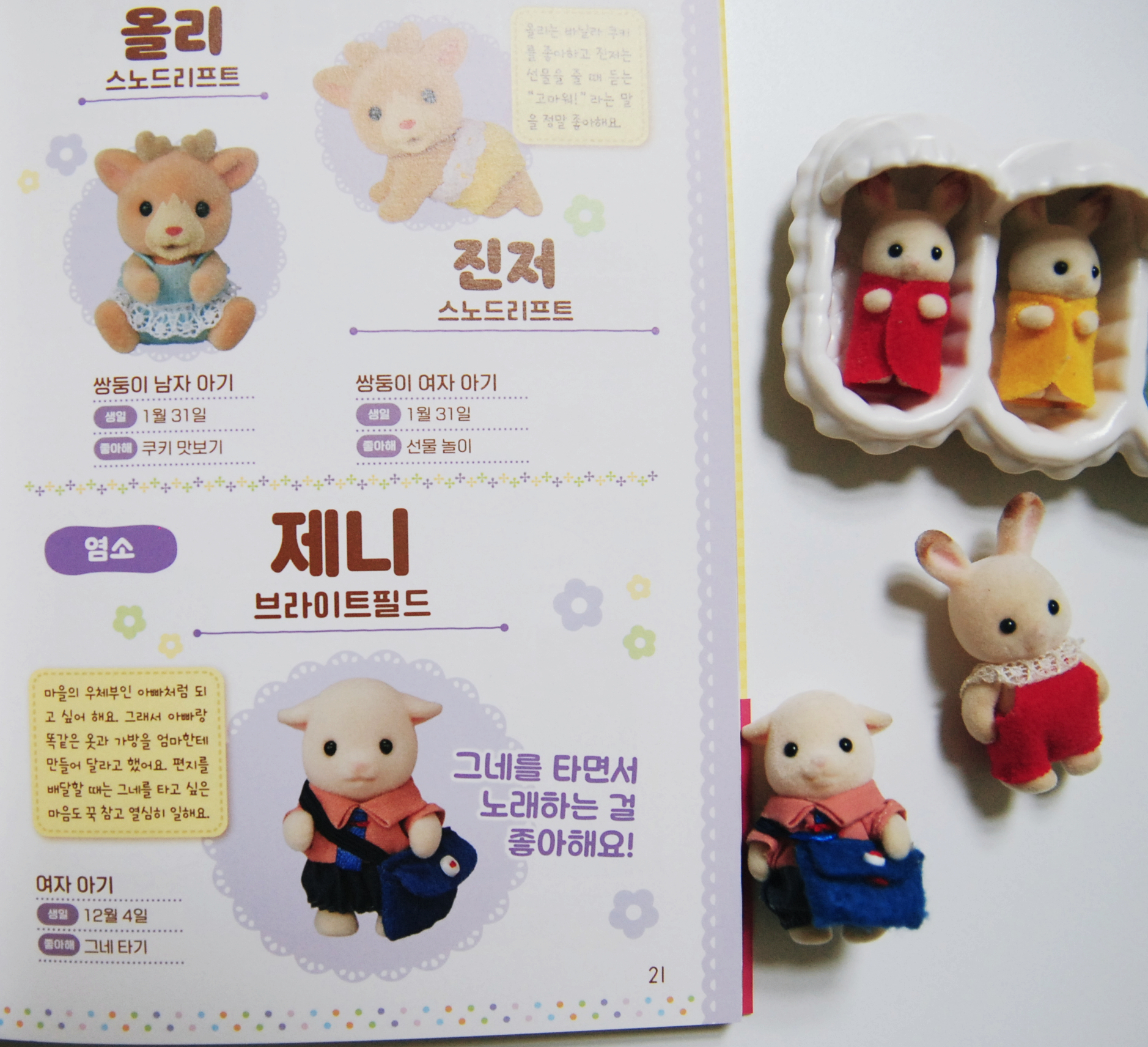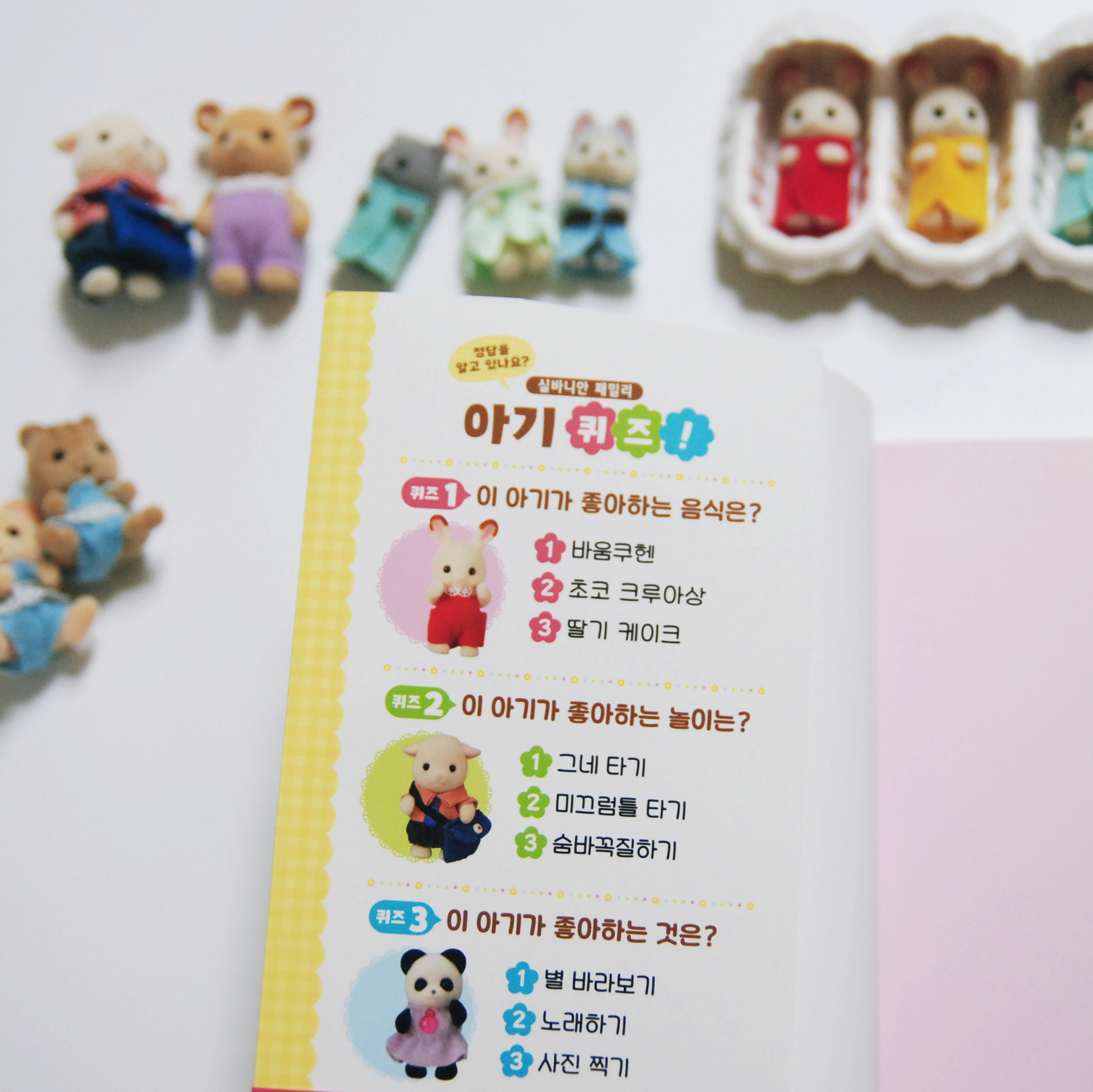 아이들뿐만 아니라 저도 정말 좋아하는 장난감이 있어요. 처음엔 인형 하나, 가구 하나로 시작한 것이 어느새 서랍 한가득 모이게 되고, 집 하나, 자동차 하나 사주던 것이 정말 다양한 집과 자동차로 구성을 하게 되었어요. 아이들이 실바니안패밀리를 가지고 놀면 자기들끼리 이름을 지어주면서 인형놀이를 하곤 했었는데 공식 아기 친구들 가이드북이 나와서 아이들이 정말 좋아했답니다. 좋아하는 인형의 이름도 알 수 있고, 좋아하는 게 뭔지 생일이 어떤지 정말 다양한 정보를 받을 수 있었답니다. 보기만 해도 힐링이 되고 사랑스러운 아기들 공식 가이드북! 한 번 만나볼까요?표지만 봐도 너무 사랑스러운 책이랍니다. 아기 친구들이랑 함께 사진 찍으니 더더욱 귀엽죠? 책날개를 보니 깜짝 아기 퀴즈가 등장했어요 ㅎ 본문을 열심히 읽어보면 충분히 맞출 수 있는 문제랍니다 ^^드디어 우리 아이들이 기대하고 있던 아이들의 이름과 성별, 그리고 생일과 좋아하는 것들이 나오기 시작합니다. 초콜릿 토끼 세쌍둥이 아기는 우리 집에도 있었는데 하나가 남자 아기였네요 ㅎ 남자 아기는 코에 색이 있는 차이점을 발견하고 신기해합니다.너무도 사랑스러운 아기들~ 사진으로 만나도 너무 귀엽죠? 귀여운 옷을 입고 꾸미는 아기들이 너무 사랑스러워 눈을 뗄 수 없답니다 ^^ 이런 귀여운 시리즈도 다 사주고 싶네요~우리 둘째가 제일 좋아했던 캐릭터는 바로 아기 양! 지금 보니 제니라고 하네요. 우리는 양양이라고 불렀었는데 반전이 여자아기였어요! 우리 둘째가 제일 놀랐던 부분이기도 하답니다. 당연히 남자 아기라고 생각했었다는;;아기들의 프로필뿐만 아니라 아기들이 자주 가는 놀이공원이나 유치원 등에 대한 소개도 들어 있어요. 그래서 꼭 한 편의 애니메이션을 보는 듯한 기분이 든다고 할까요? 사랑스러운 아기들의 일상과 귀엽고 예쁘게 꾸민 아기들의 모습까지 너무 보기 좋게 담겨있어서 시간 가는 줄 모른답니다.아기들이 너무 사랑스러워서 그 모습만 보고 있어서 책에 푹 빠져드는 걸 느낄 수 있어요. 우리 아이들도 책을 보고 또 보고, 인형을 가지고 나와서 비교해 보기도 하고 너무 즐거워하더라고요. 저 역시 새로운 사실과 정보들을 알 수 있어서 실바니안 아기 친구들이 더욱 가깝게 느껴졌던 것 같아요 ^^ 실바니안 패밀리 좋아하는 친구들은 공식 아기 친구들 가이드북이 필수인 것 같아요 ^^ 너무 사랑스러운 아기 친구들을 만나볼 수 있답니다~