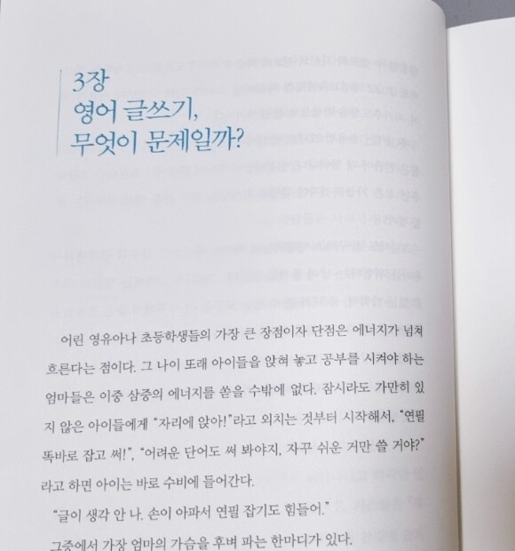 듣기나 말하기, 읽기는 비교적 엄마표로도 하기 수월한데 쓰기는 정말 어렵다는 생각을 늘 가지고 있었던 것 같아요. 정말 학원을 보내야 하나, 외국에 가지 않고도 아이가 충분히 도움을 받을 수 있는 방법이 없을까라는 생각을 많이 하게 되었던 것 같아요. 사실 이 책을 선택한 가장 큰 이유는 표지에 적힌 한 마디였어요. "한 줄도 못 쓰는 아이가 미국 초등학생처럼 쓸 수 있는 방법을 알아본다." 정말 솔깃해지지 않나요? 엄마표 영어를 하는 저에겐 정말 달콤한 유혹이었답니다.