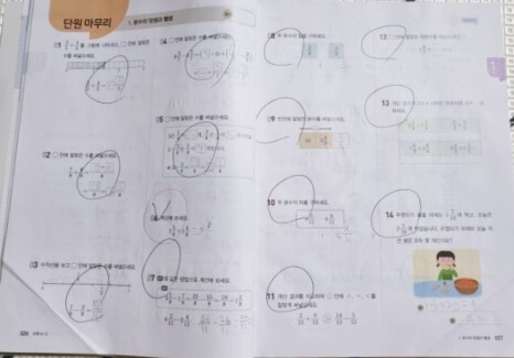 우리 아이가 열심히 푼 흔적들을 한 번 볼까요? 문항수도 적절한 편이에요. 아이가 개념을 공부하고 문제를 풀기 딱 좋답니다. 문제집도 문제가 너무 많거나 그림이나 색이 없으면 아이가 문제집을 풀기 전부터 지겨워하는 모습을 보여주는데 큐브수학 개념은 문항수도 적절하고 풀기에 좋아요. 우리 아이도 열심히 잘 풀어나갔답니다. 아직 배우지 않은 2학기 문제인데도 개념을 보고 열심히 잘 풀어나갑니다. 2학기 1단원이 바로 분수의 덧셈과 뺄셈이네요. 분수의 덧셈과 뺄셈은 아이들이 많이 어려워해서 포기를 많이 한다고 하니 기본 개념을 더욱 꼼꼼하게 공부시켜야겠다는 생각이 듭니다. 앞에서 배웠던 교과서 개념들을 문제를 통해 한 번 더 공부한다고 생각하면 된답니다.