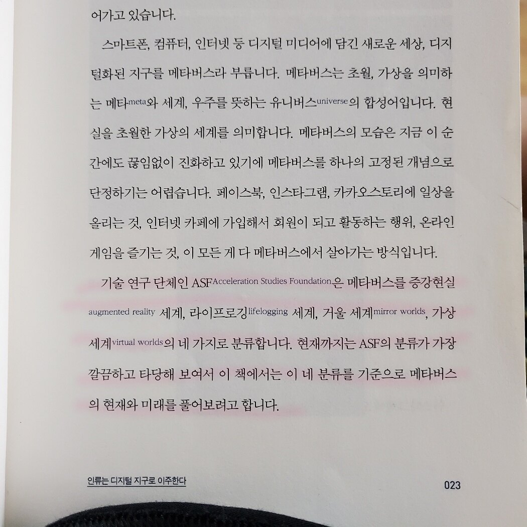 기술 연구 단체인 ASFAcceleration Studies Foundation은 메타버스를 증강현실augmented reality 세계, 라이프로깅 lifelogging 세계, 거울 세계mirror worlds, 가상세계 virtual worlds 의 네 가지로 분류합니다. 현재까지는 ASF의 분류가 가장깔끔하고 타당해 보여서 이 책에서는 이 네 분류를 기준으로 메타버스의 현재와 미래를 풀어보려고 합니다.인류는 디지털 지구로 이주한다 - P23