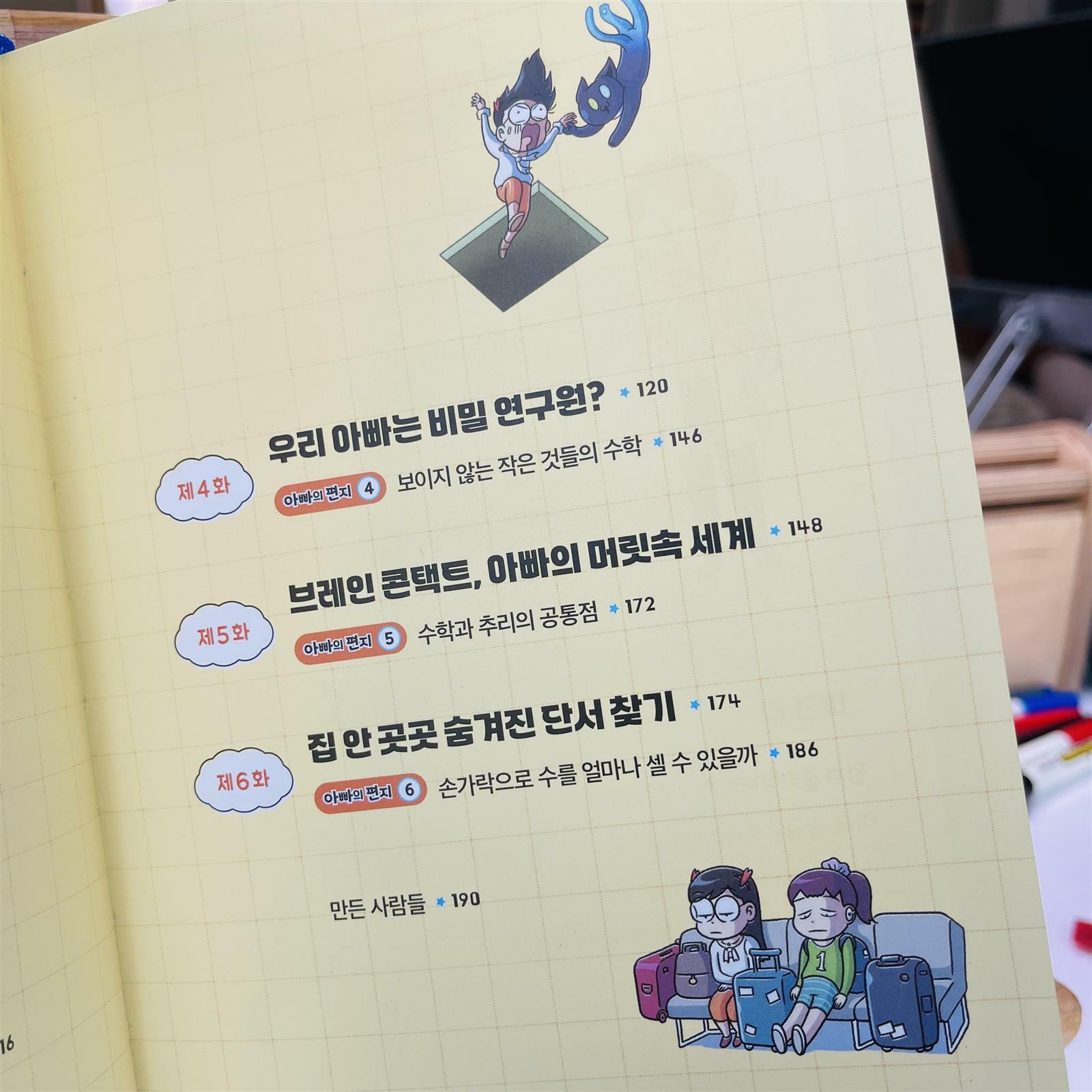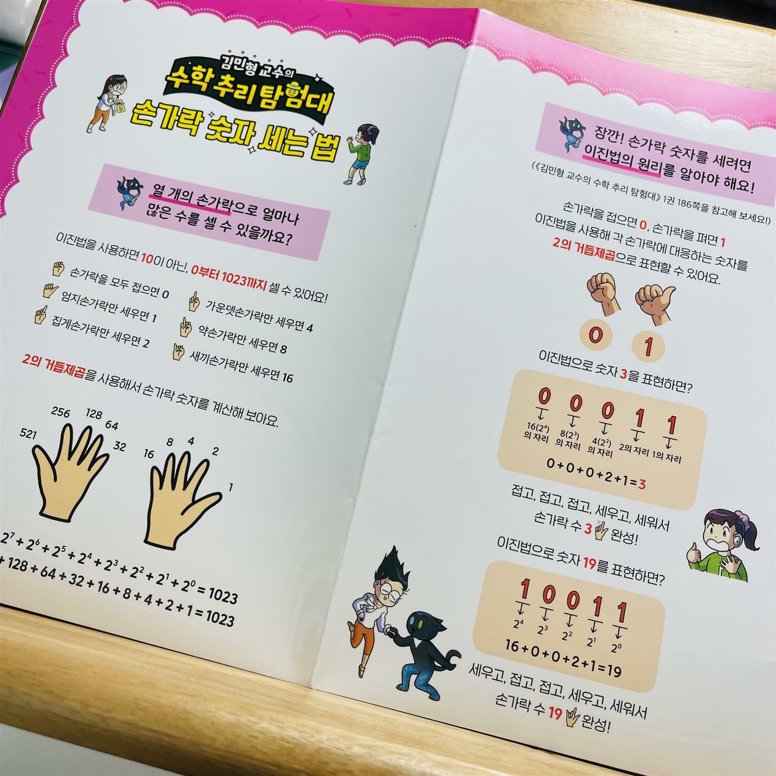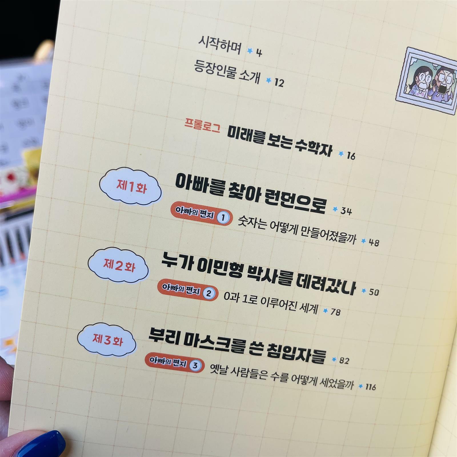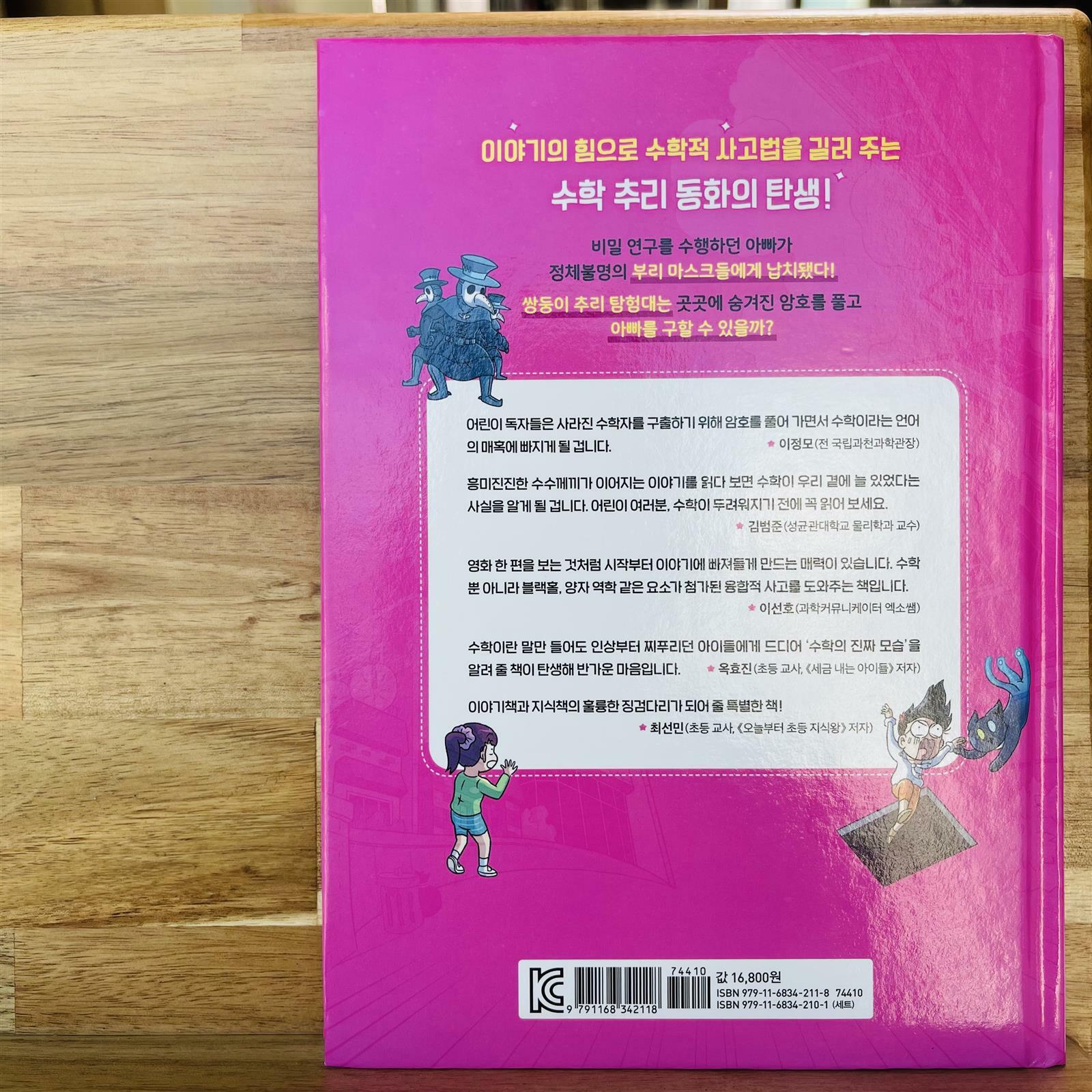비밀 연구를 하던 아빠가 사라졌다?! 쌍둥이들은 사라진 아빠를 찾기 위해 할머니와 함께 런던으로 날아가고 . 아빠와 함께 연구를 진행하던 박사님과 함께 아빠 숙소 지하의 비밀기지를 가게 된다. 비밀기지 이외에 아빠가 숨겨놓은 여러 장치들의 암호를 풀어나가는 우리의 쌍둥이 추리 탐험대 . 아빠의 해방 찾을 수 있는 단서를 발견할 수 있을까? 아빠는 대체 어디에 있는 건인가~!! . 수학도 이렇게 재미있는 그리고 흥미진진한 전개를 가지고 동화로 표현될 수 있다는 점이 색다르게 다가왔던 계기가 되었다 . 수학 동화 사실 수학이라는 키워드에 집중되어 있다보니 이야기로 만들어 져도 재미보단 지식책에 가까운 도서들이 많았다보니 사실 처음 읽기 전에도 이전에 읽었던 책들과 다르지 않을꺼란 선입견을 가지고 있었다 . BUT !! 암호를 풀어가는 과정에서 이진법을 쉽게 이해할 수 있게 이야기가 전개되어져 있었고 일반적인 지식만 동화가 아니었기에 아이도 다음 이야기를 궁금해 하며 책읽기를 이어나갈 수 있었다 . 초1이 읽기에는 약간 버거울 수 있겠다 싶었지만 만화 비중 많이 포함되어져 있어서 글밥 긴~~거 읽다가 숨실틈 충분히 주어지니 생각보다 버거워하지 않앗고 같이 읽어주는 엄마 입장에서도 너무 글밥이 많은건 읽어주기 사실 버거운에 숨쉴틈 주니 재밌게 흥미를 가지며 읽을 수 있었던 이야기 수학 동화였다 :)