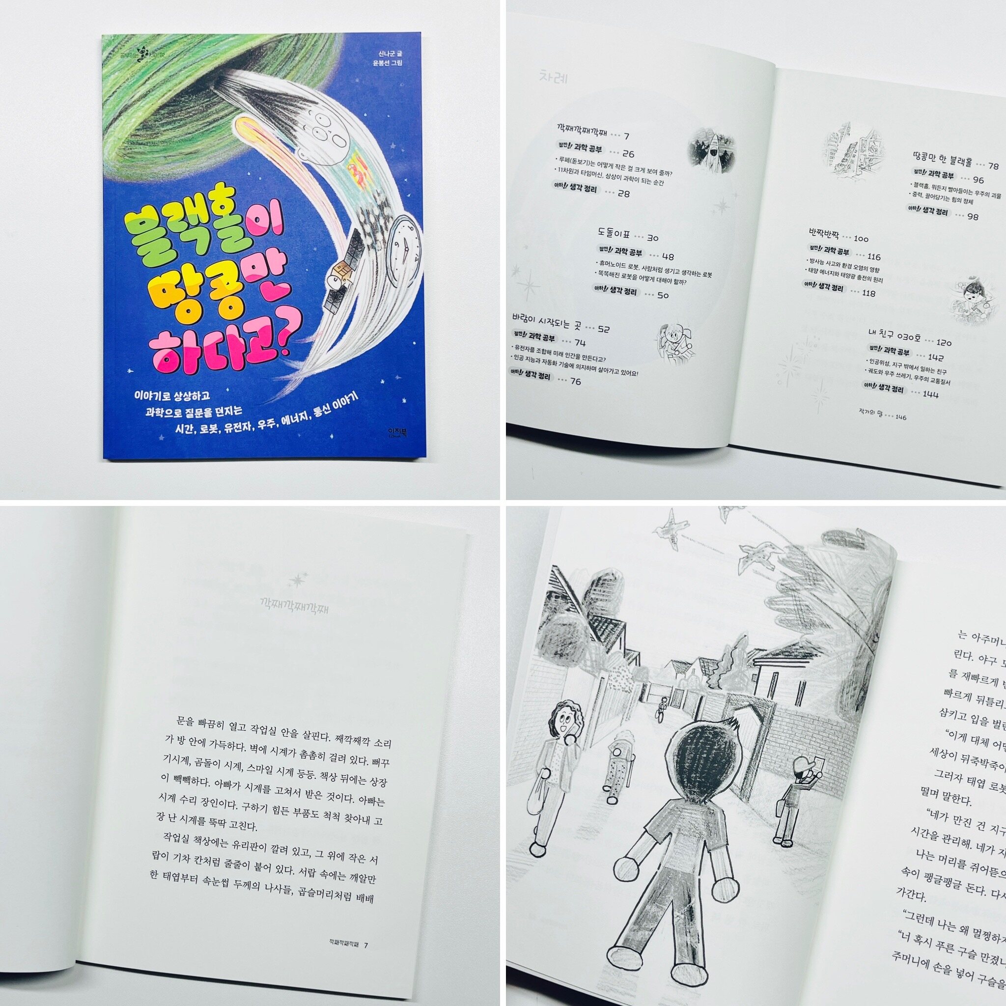 #도서제공 #도서협찬 . 📚 블랙홀이 땅콩만 하다고? . . 요즘 우리 아이가 자주 묻는 질문이 있어요 엄마 시간이 멈추면 어떻게 돼 그 질문을 들은 날 함께 읽은 책이 바로 :: 블랙홀이 땅콩만 하다고? :: 처음엔 제목이 재미있다며 웃었어요 머릿속에 땅콩만 한 블랙홀이 있다니 상상만으로도 장난기 가득한 이야기 같았거든요 그런데 몇 장 넘기지 않아 분위기가 달라졌어요 시간이 멈추면 세상도 고장 난다는 문장을 읽고 아이가 조용해졌어요 행복한 순간에 시간을 멈추고 싶다는 생각 한 번쯤 해봤잖아요 아이도 고개를 끄덕였어요 그런데 시간이 흐르지 않으면 우주도 멈추고 우리도 멈춘다는 이야기 앞에서 표정이 달라졌어요 상상으로 시작했는데 어느새 진짜 질문이 되었어요 이 책은 여섯 편의 과학 동화를 담고 있어요 미래 사회 인공지능 유전자 환경 우주 어렵게 느껴질 수 있는 주제지만 이야기로 먼저 다가와요 감정을 느끼는 휴머노이드 아이가 등장하는 장면에서는 아이가 제 옆을 톡 건드렸어요 로봇도 슬퍼 상처받아 그 질문이 참 오래 남았어요 가족에게 외면받고 방 안에서 전선을 연결해 전기를 충전하는 장면을 읽으며 아이는 한참 그림을 바라봤어요 우리가 로봇을 함부로 대해도 돼 똑똑해지면 사람처럼 생각하는 거 아니야 과학 개념을 배우는 시간이 아니라 사람에 대해 이야기하는 시간이 되었어요 이 책이 좋았던 이유는 이야기만 던지고 끝나지 않는다는 점이에요 중간에 등장하는 잠깐 과학 공부 코너 루페는 어떻게 작은 것을 크게 보이게 할까 11차원은 무엇일까 휴머노이드 로봇은 어떻게 만들어질까 핵심만 또렷하게 정리해줘요 아이도 부담 없이 읽을 수 있었어요 그리고 이야기 끝에는 아하 생각 정리 줄거리 확인이 아니라 너라면 어떻게 할래 라는 질문이에요 시간을 멈추고 싶은 순간은 언제인지 감정을 느끼는 로봇을 우리는 어떻게 대해야 하는지 정해진 미래 대신 다른 선택을 할 용기는 있는지 책을 덮고도 대화가 이어졌어요 초등 고학년이 읽기에 특히 좋아 보였어요 이야기를 따라가며 몰입하고 중간에 개념을 정리하고 마지막에 생각을 확장하는 구조 교과와도 자연스럽게 연결돼요 과학 시간에 배우는 태양계 빛과 시간 환경과 생명 하지만 무엇보다 좋았던 건 아이가 스스로 질문하기 시작했다는 점이에요 만약 유전자로 미래가 정해지면 나는 다른 선택을 할 수 없어 그 한 문장이 이 책의 힘 같았어요 상상으로 시작해 과학으로 사고를 넓히는 시간 과학을 좋아하는 아이에게도 이야기를 좋아하는 아이에게도 한 번쯤 건네보고 싶은 책이에요 어렵지 않게 하지만 가볍지도 않게 생각을 남기는 과학 동화 아이와 나란히 앉아 읽고 한 페이지에서 멈춰 이야기 나누기 좋은 책 :: 블랙홀이 땅콩만 하다고? :: 상상력에 질문을 더해주고 싶은 날 함께 펼쳐보셔도 좋겠어요 블랙홀이 땅콩만 하다고? 📚 많.관.부 :) #초등과학동화 #블랙홀이땅콩만하다고 #이지북 #공부하는샤미 #초등고학년추천 #인공지능동화 #환경동화 #우주이야기 #초등독서추천 #과학책추천