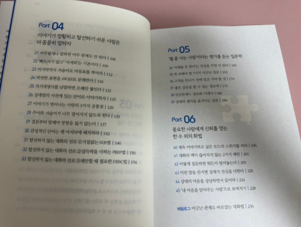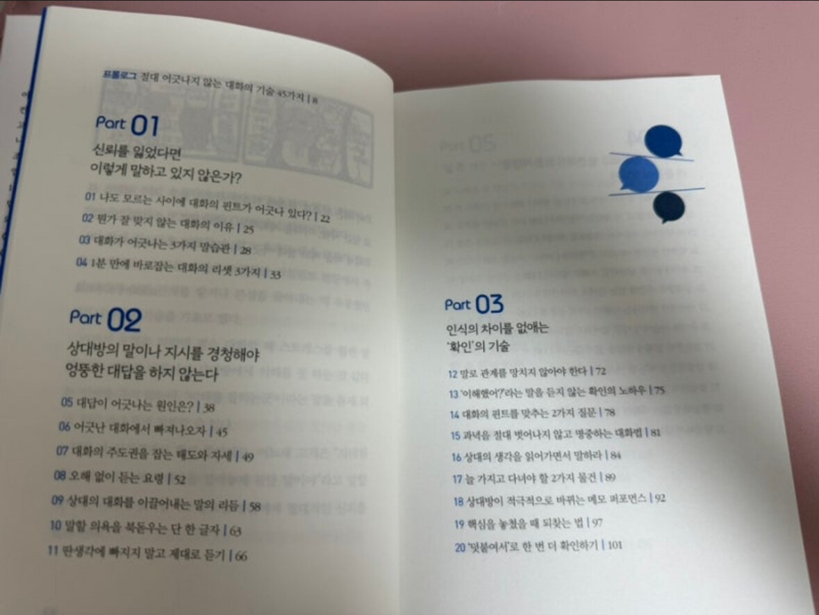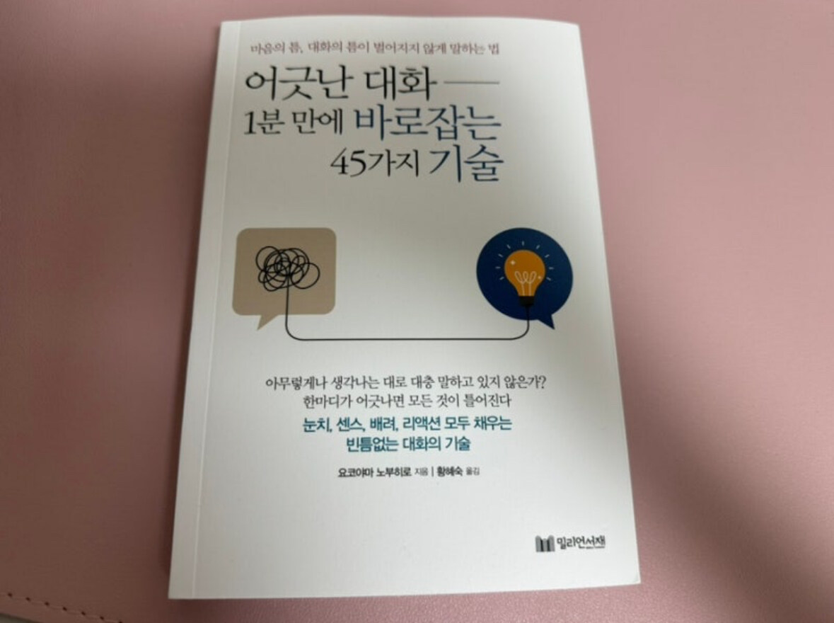 "어긋난 대화 1분 만에 바로잡는 45가지 기술"책에서는 마음의 틈, 대화의 틈이 벌어지지 않게 말하는 법을 알려주는데 눈치, 센스, 배려, 리액션 모두 채우는 빈틈없는 대화의 기술을 배울 수 있는 책이다.