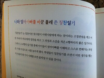 모래알처럼 흩어졌던 가정들이 바위처럼 뭉쳐졌고,집에 들어가기 싫어서 배회하던 학생들이 행복을 기대하는 마음으로 집에 들어섰고,왜 사는지를 몰라 힘들어 하던 부모들은 삶의 보람과 가정의 소중함을 알게 되었습니다.눈물과 웃음으로 가득 차 있는 칭찬일기를 읽으면서 저도 수없이 울고 웃어야 했습니다.